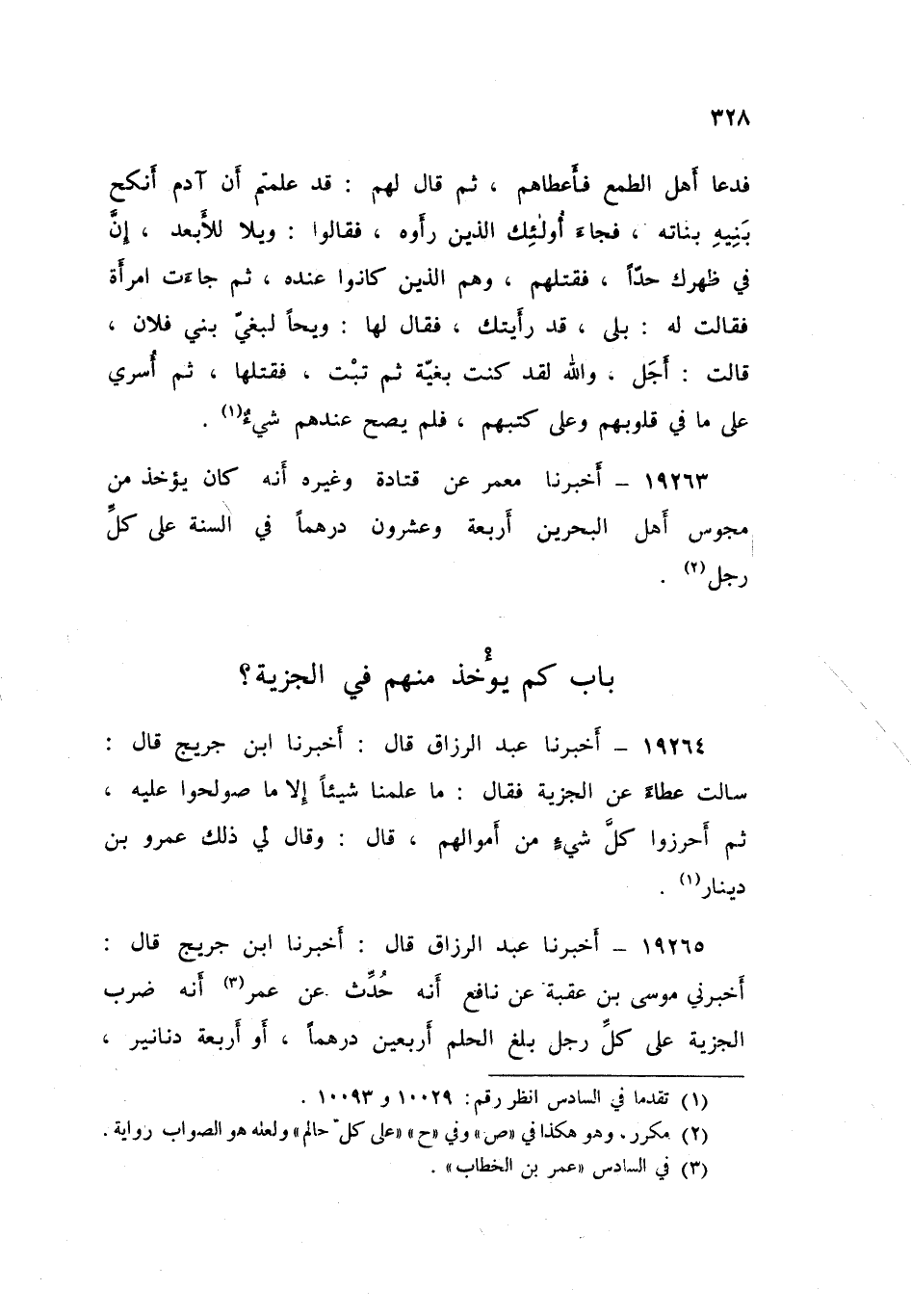 19265 - عَبْدُ الرَّزَّاقِ، أَخْبَرَنَا ابْنُ جُرَيْجٍ , قَالَ: أَخْبَرَنِي مُوسَى بْنُ عُقْبَةَ , عَنْ نَافِعٍ أَنَّهُ حَدَّثَ عَنْ عُمَرَ أَنَّهُ: «§ضَرَبَ الْجِزْيَةَ عَلَى كُلِّ رَجُلٍ بَلَغَ الْحُلُمَ أَرْبَعِينَ دِرْهَمًا - أَوْ أَرْبَعَةَ دَنَانِيرَ - فَجَعَلَ الْوَرِقَ عَلَى مَنْ كَانَ مِنْهُمْ بِالْعِرَاقِ لِأَنَّهَا أَرْضُ وَرِقٍ , وَجَعَلَ الذَّهَبَ عَلَى أَهْلِ الشَّامِ وَمِصْرَ لِأَنَّهَا أَرْضُ الذَّهَبِ , وَضَرَبَ عَلَيْهِمْ مَعَ ذَلِكَ أَرْزَاقَ الْمُسْلِمِينَ وَكِسْوَتَهُمُ الَّتِي كَانَ عُمَرُ يَكْسُوَهَا النَّاسَ وَضِيَافَةَ مِنْ نَزَلَ بِهِمْ مِنَ الْمُسْلِمِينَ ثَلَاثَ لَيَالٍ وَأَيَّامِهِنَّ»