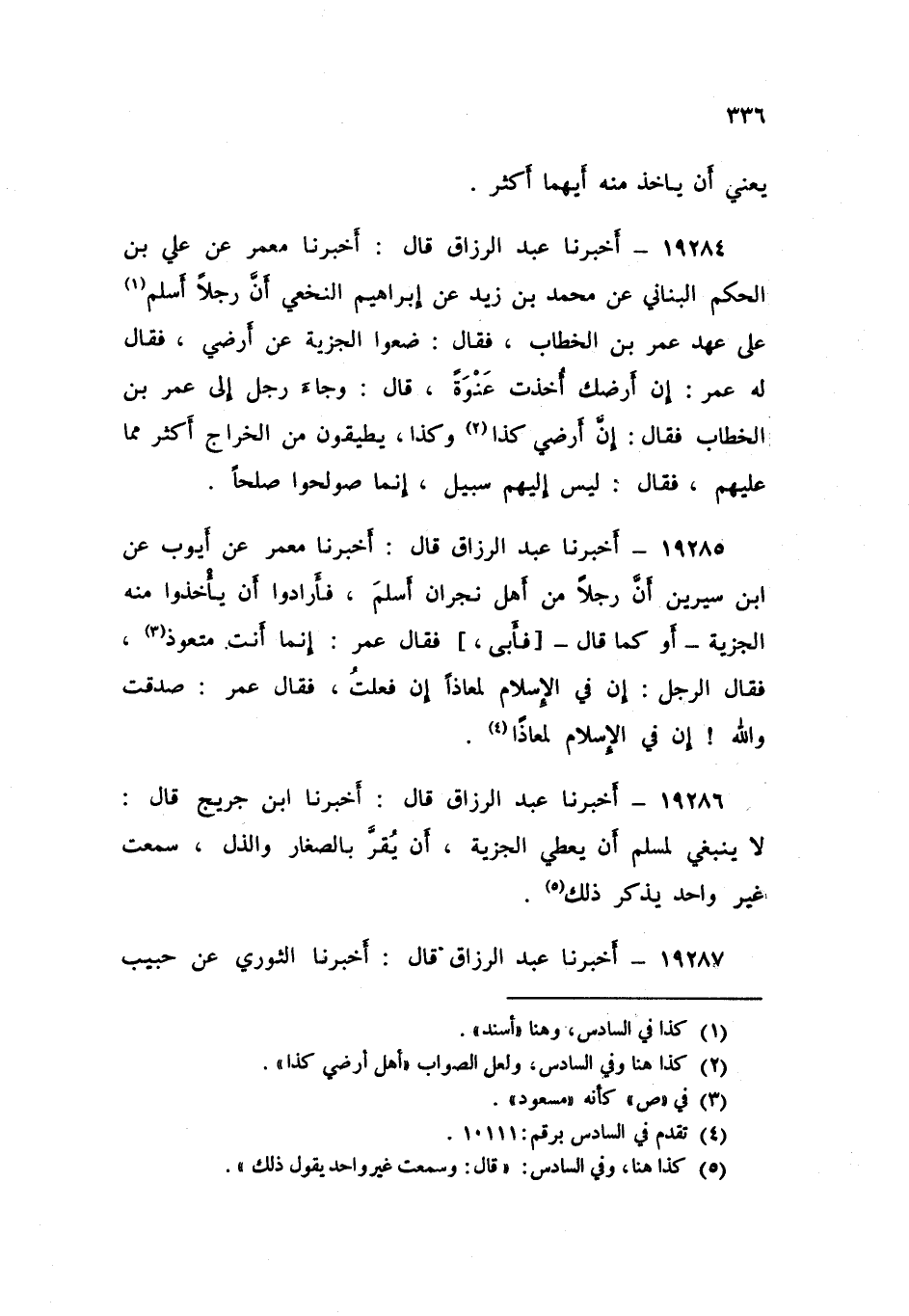 19286 - عَبْدُ الرَّزَّاقِ قال: أَخْبَرَنَا ابْنُ جُرَيْجٍ قَالَ: «§لَا يَنْبَغِي لِمُسْلِمٍ أَنْ يُعْطِيَ الْجِزْيَةَ أَنْ يُقِرَّ بِالصَّغَارِ وَالذُّلِّ» , سَمِعْتُ غَيْرَ وَاحِدٍ يَذْكُرُ ذَلِكَ