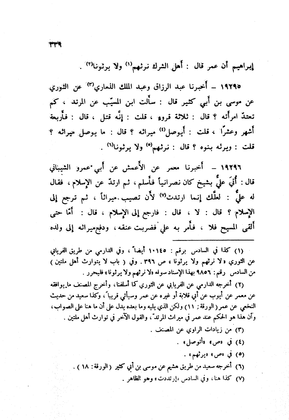 19296 - أَخْبَرَنَا مَعْمَرٌ , عَنِ الْأَعْمَشِ , عَنْ أَبِي عَمْرٍو الشَّيْبَانِيِّ , قَالَ: أُتِيَ عَلِيٌّ بِشَيْخٍ كَانَ نَصْرَانِيًّا , فَأَسْلَمَ ثُمَّ §ارْتَدَّ عَنِ الْإِسْلَامِ , فَقَالَ لَهُ عَلِيٌّ: «لَعَلَّكَ إِنَّمَا ارْتَدَتَّ لِأَنْ تُصِيبَ مِيرَاثًا , ثُمَّ تَرْجِعَ إِلَى الْإِسْلَامِ؟» قَالَ: لَا , قَالَ: «فَارْجِعْ إِلَى الْإِسْلَامِ» , قَالَ: أَمَا حَتَّى أَلْقَى الْمَسِيحَ فَلَا , فَأَمَرَ بِهِ عَلِيٌّ فَضُرِبَتْ عُنُقُهُ، وَدُفِعَ مِيرَاثُهُ إِلَى وَلَدِهِ الْمُسْلِمِينَ , أَخْبَرَنَا