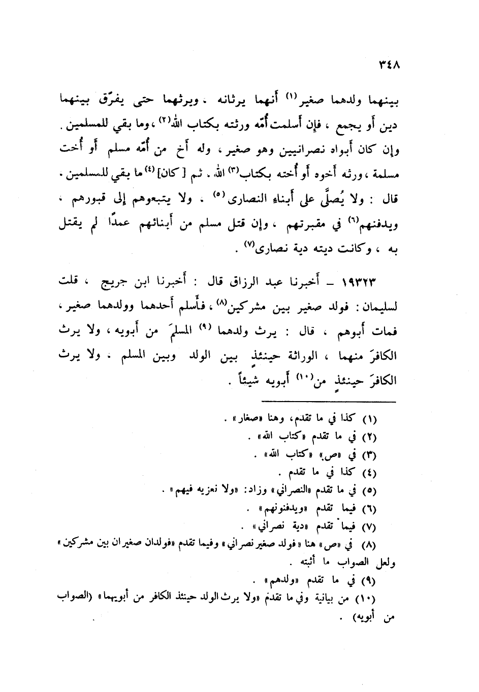 19323 - عَبْدُ الرَّزَّاقِ قال: أَخْبَرَنَا ابْنُ جُرَيْجٍ , قُلْتُ لِسُلَيْمَانَ: فَوَلَدٌ صَغِيرٌ بَيْنَ مُشْرِكَيْنِ , فَأَسْلَمَ أَحَدُهُمَا وَوَلَدُهُمَا صَغِيرٌ فَمَاتَ أَبُوهُمْ؟ قَالَ: «§يَرِثُ وَلَدُهُمَا الْمُسْلِمُ مِنْ أَبَوَيْهِ , وَلَا يَرِثُ الْكَافِرُ مِنْهُمَا، الْوِرَاثَةُ حِينَئِذٍ بَيْنَ الْوَلَدِ وَبَيْنَ الْمُسْلِمِ , وَلَا يَرِثُ الْكَافِرُ حِينَئِذٍ مِنْ أَبَوَيْهِ شَيْئًا»
