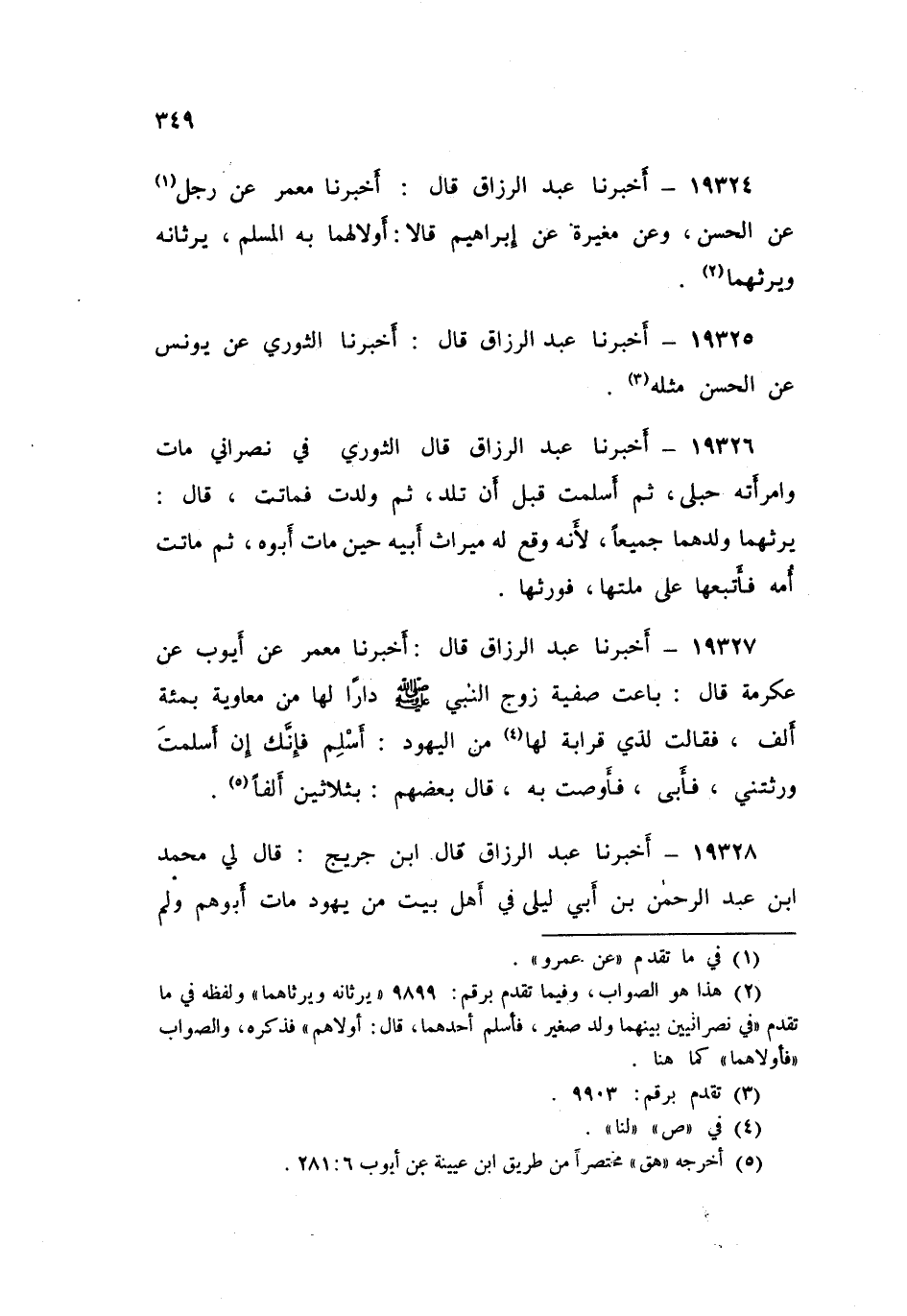 19328 - عَبْدُ الرَّزَّاقِ قال: ابْنُ جُرَيْجٍ: قَالَ لِي مُحَمَّدُ بْنُ عَبْدِ الرَّحْمَنِ بْنِ أَبِي لَيْلَى: فِي أَهْلِ بَيْتٍ مِنْ يَهُودَ مَاتَ أَبُوهُمْ وَلَمْ يُقْسَمْ مِيرَاثُهُ حَتَّى أَسْلَمُوا: «§لَيْسَ عَلَى قِسْمَةِ الْإِسْلَامِ , وَقَعَتِ الْمَوَارِيثُ قَبْلَ أَنْ يُسْلِمُوا»