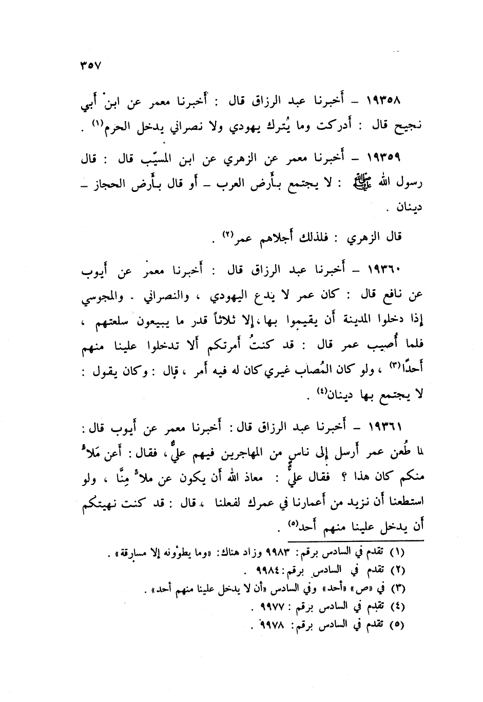 19360 - عَبْدُ الرَّزَّاقِ، أَخْبَرَنَا مَعْمَرٌ , عَنْ أَيُّوبَ , عَنْ نَافِعٍ قَالَ: كَانَ عُمَرُ: «§لَا يَدَعُ الْيَهُودِيَّ وَالنَّصْرَانِيَّ وَالْمَجُوسِيَّ إِذَا دَخَلُوا الْمَدِينَةَ أَنْ يُقِيمُوا بِهَا إِلَّا ثَلَاثًا قَدْرَ مَا يَبِيعُونَ سِلْعَتَهُمْ» , فَلَمَّا أُصِيبَ عُمَرُ قَالَ: «قَدْ كُنْتُ أَمَرْتُكُمْ أَلَّا تُدْخِلُوا عَلَيْنَا مِنْهُمْ أَحَدًا , وَلَوْ كَانَ الْمُصَابُ غَيْرِي كَانَ لَهُ فِيهِ أَمْرٌ» قَالَ: وَكَانَ يَقُولُ: «لَا يَجْتَمِعُ بِهَا دِينَانِ»