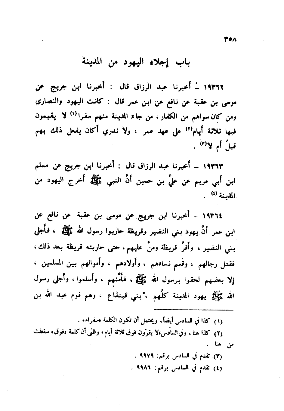 19363 - عَبْدُ الرَّزَّاقِ قال: أَخْبَرَنَا ابْنُ جُرَيْجٍ , عَنْ مُسْلِمِ بْنِ أَبِي مَرْيَمَ , عَنْ عَلِي بْنِ حُسَيْنٍ , «أَنَّ النَّبِيَّ صَلَّى اللهُ عَلَيْهِ وَسَلَّمَ §أَخْرَجَ الْيَهُودَ مِنَ الْمَدِينَةِ»