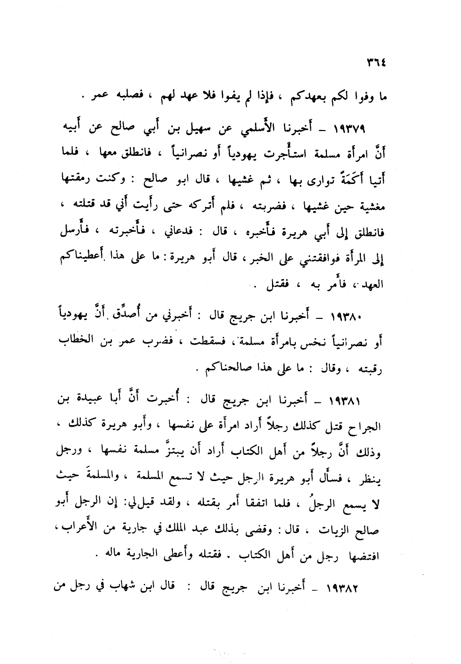 19381 - أَخْبَرَنَا ابْنُ جُرَيْجٍ قَالَ: أُخْبِرْتُ " أَنَّ أَبَا عُبَيْدَةَ بْنَ الْجَرَّاحِ قَتَلَ كَذَلِكَ رَجُلًا أَرَادَ امْرَأَةً عَلَى نَفْسِهَا , وَأَبُو هُرَيْرَةَ كَذَلِكَ , وَذَلِكَ أَنَّ §رَجُلًا مِنْ أَهْلِ الْكِتَابِ أَرَادَ أَنْ يَبْتَزَّ مُسْلِمَةً نَفْسَهَا وَرَجُلٌ يَنْظُرُ , فَسَأَلَ أَبُو هُرَيْرَةَ الرَّجُلَ حَيْثُ لَا تَسْمَعُ الْمُسْلِمَةُ وَالْمُسْلِمَةَ حَيْثُ لَا يَسْمَعُ الرَّجُلُ , فَلَمَّا اتَّفَقَا أَمَرَ بِقَتْلِهِ , وَلَقَدْ قِيلَ لِي: إِنَّ الرَّجُلَ أَبُو صَالِحٍ الزَّيَّاتُ " قَالَ: «وَقَضَى بِذَلِكَ عَبْدُ الْمَلِكِ فِي جَارِيَةٍ مِنَ الْأَعْرَابِ افْتَضَّهَا رَجُلٌ مِنْ أَهْلِ الْكِتَابِ فَقَتَلَهُ وَأَعْطَى الْجَارِيَةَ مَالَهُ»