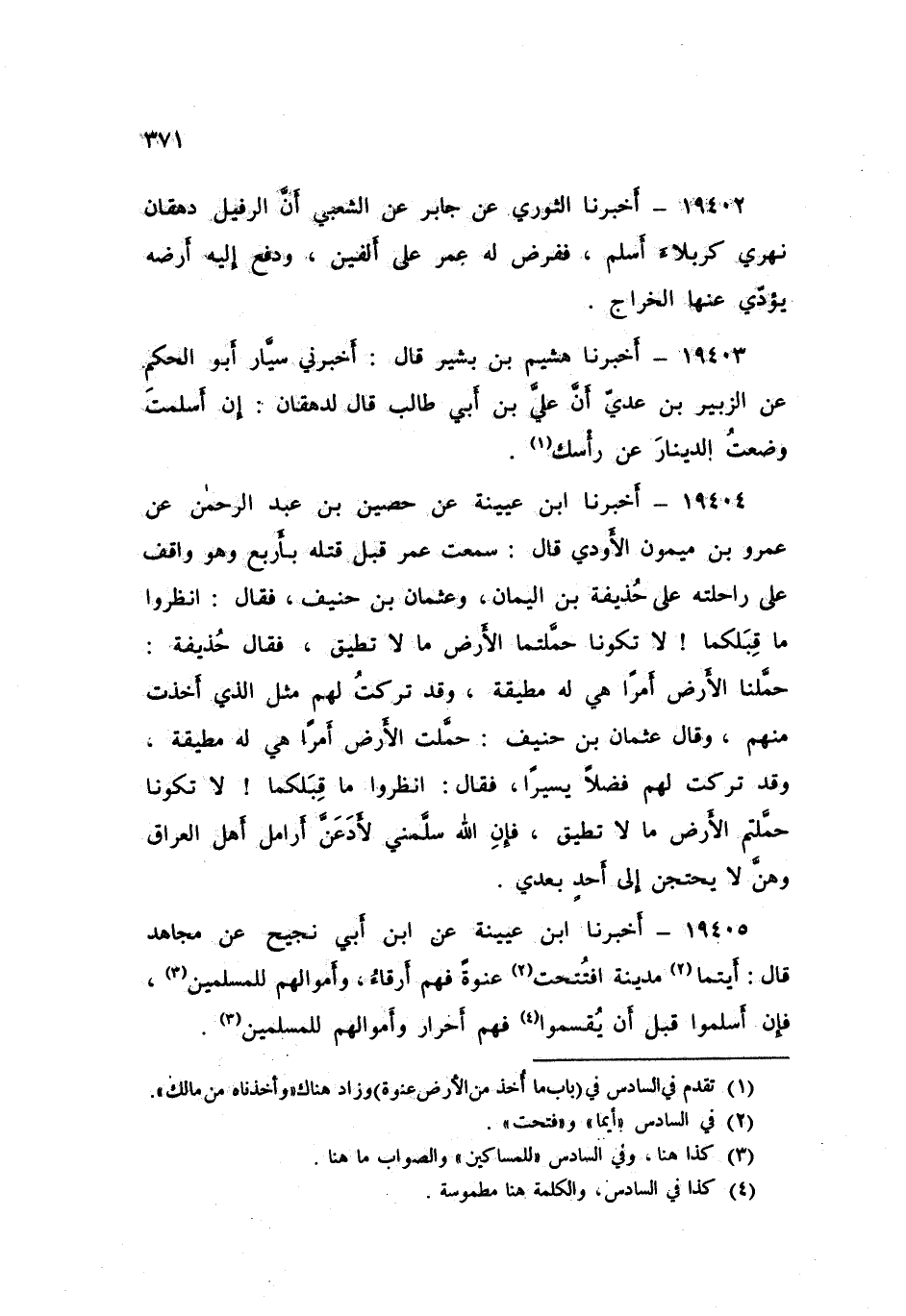 19404 - أَخْبَرَنَا ابْنُ عُيَيْنَةَ , عَنْ حُصَيْنِ بْنِ عَبْدِ الرَّحْمَنِ , عَنْ عَمْرِو بْنِ مَيْمُونٍ الْأَوْدِيِّ قَالَ: سَمِعْتُ عُمَرَ - قَبْلَ قَتْلِهِ بِأَرْبَعٍ - وَهُو وَاقِفٌ عَلَى رَاحِلَتِهِ عَلَى حُذَيْفَةَ بْنِ الْيَمَانِ , وَعُثْمَانَ بْنِ حُنَيْفٍ فَقَالَ: «انْظُرُوا مَا قِبَلَكُمَا لَا تَكُونَا حَمَّلْتُمَا الْأَرْضَ مَا لَا تُطِيقُ» , فَقَالَ حُذَيْفَةُ: حَمَّلْنَا الْأَرْضَ أَمْرًا هِيَ لَهُ مُطِيقَةٌ , وَقَدْ تَرَكْتُ لَهُمْ مِثْلَ الَّذِي أَخَذْتُ مِنْهُمْ , وَقَالَ عُثْمَانُ بْنُ حُنَيْفٍ: حَمَّلْتُ الْأَرْضَ أَمْرًا هِيَ لَهُ مُطِيقَةٌ , وَقَدْ تَرَكْتُ لَهُمْ فَضْلًا يَسِيرًا , فَقَالَ: «§انْظُرُوا مَا قِبَلَكُمَا لَا تَكُونَا حَمَّلْتُمُ الْأَرْضَ مَا لَا تُطِيقُ , فَإِنِ اللَّهُ سَلَّمَنِي لَأَدَعَنَّ أَرَامِلَ أَهْلِ الْعِرَاقِ وَهُنَّ لَا يَحْتَجْنَ إِلَى أَحَدٍ بَعْدِي»