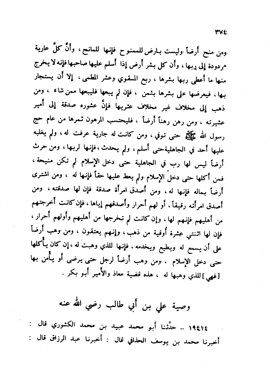 19414 - حَدَّثَنَاَ أَبُو مُحَمَّدٍ عُبَيْدُ بْنُ مُحَمَّدٍ الْكَشْوُرِيُّ قَالَ: أَخْبَرَنَا مُحَمَّدُ بْنُ يُوسُفَ الْحُذَافِيُّ قَالَ: أَخْبَرَنَا عَبْدُ الرَّزَّاقِ قال -[375]-: أَخْبَرَنَا مَعْمَرٌ , عَنْ أَيُّوبَ , أَنَّهُ أَخَذَ هَذَا الْكِتَابَ مِنْ عَمْرِو بْنِ دِينَارٍ , هَذَا مَا أَقَرَّ بِهِ وَقَضَى فِي مَالِهِ عَلِيُّ بْنُ أَبِي طَالِبٍ: «§تَصَدَّقَ بِيَنْبُعَ ابْتِغَاءَ مَرْضَاةِ اللَّهِ لِيُولِجَنِي الْجَنَّةَ , وَيَصْرِفَ النَّارَ عَنِّي , وَيَصْرِفَنِي عَنِ النَّارِ , فَهِيَ فِي سَبِيلِ اللَّهِ وَوَجْهِهِ , يُنْفَقُ فِي كُلِّ نَفَقَةٍ مِنْ سَبِيلِ اللَّهِ وَوَجْهِهِ , فِي الْحَرْبِ وَالسِّلْمِ , وَالْخَيْرِ وَذَوِي الرَّحِمِ , وَالْقَرِيبِ وَالْبَعِيدِ , لَا يُبَاعُ , وَلَا يُوهَبُ , وَلَا يُورَّثُ , كُلُّ مَالٍ فِي يَنْبُعَ , غَيْرَ أَنَّ رَبَاحًا وَأَبَا نِيزَرٍ وَجُبَيْرًا إِنْ حَدَثَ بِي حَدَثٌ لَيْسَ عَلَيْهِمْ سَبِيلٌ , وَهُمْ مُحَرَّرُونَ مَوَالٍ يَعْمَلُونَ فِي الْمَالِ خَمْسَ حِجَجٍ , وَفِيهِ نَفَقَاتُهُمْ وَرِزْقُهُمْ , وَرِزْقُ أَهْلِيهِمْ , فَذَلِكَ الَّذِي أَقْضِي فِيمَا كَانَ لِي فِي يَنْبُعَ جَانِبِهِ حَيًّا أَنَا أَوْ مَيِّتًا , وَمَعَهَا مَا كَانَ لِي بِوَادِي أُمِّ الْقُرَى مِنْ مَالٍ وَرَقِيقٍ حَيًّا أَنَا أَوْ مَيِّتًا , وَمَعَ ذَلِكَ الْأُذَيْنَةُ وَأَهْلُهَا حَيًّا أَنَا أَوْ مَيِّتًا , وَمَعَ ذَلِكَ رَعْدٌ وَأَهْلُهَا , غَيْرَ أَنَّ زُرَيْقًا مِثْلُ مَا كَتَبْتُ لِأَبِي نِيزَرٍ وَرَبَاحٍ وَجُبَيْرٍ وَأَنَّ يَنْبُعَ وَمَا فِي وَادِي الْقُرَى وَالْأُذَيْنَةِ وَرَعْدٌ يُنْفَقُ فِي كُلِّ نَفَقَةٍ ابْتِغَاءً بِذَلِكَ وَجْهَ اللَّهِ فِي سَبِيلِهِ يَوْمَ تَسْوَدُّ وُجُوهٌ وَتَبْيَضُّ وُجُوهٌ , لَا يُبَعْنَ , وَلَا يُوهَبْنَ , وَلَا يُورَّثْنَ إِلَّا إِلَى اللَّهِ , هُوَ يَتَقَبَّلَهُنَّ وَهُو يَرِثُهُنَّ , فَذَلِكَ قَضِيَّةٌ بَيْنِي وَبَيْنَ اللَّهِ الغدَ مِنْ يَوْمِ قَدِمْتُ مَسْكَنَ حَيًّا أَنَا أَوْ مَيِّتًا , فَهَذَا مَا قَضَى عَلِيٌّ فِي مَالِهِ وَاجِبَةً بَتْلَةً , ثُمَّ يَقُومُ عَلَى ذَلِكَ بَنُو عَلِيٍّ بِأَمَانَةٍ وَإِصْلَاحٍ , كَإِصْلَاحِهِمْ أَمْوَالَهُمْ , يُزْرَعُ وَيُصْلَحُ كَإِصْلَاحِهِمْ أَمْوَالَهُمْ , وَلَا يُبَاعُ مِنْ أَوْلَادِ عَلِيٍّ مِنْ هَذِهِ الْقُرَى الْأَرْبَعِ وَدِيَّةٌ وَاحِدَةٌ , حَتَّى يَسُدَّ أَرْضَهَا غِرَاسُهَا , قَائِمَةً عِمَارَتُهَا لِلْمُؤْمِنِينَ أَوَّلِهِمْ وَآخِرِهِمْ , فَمَنْ وَلِيَهَا مِنَ النَّاسِ فَأُذَكِّرُ اللَّهَ إِلَّا جَهَدَ وَنَصَحَ , وَحَفِظَ أَمَانَتَهُ , هَذَا كِتَابُ -[376]- عَلِيِّ بْنِ أَبِي طَالِبٍ بِيَدِهِ إِذْ قَدِمَ مَسْكَنَ , وَقَدْ أَوْصَيْتُ 000 الْفَقِيرَيْنِ فِي سَبِيلِ اللَّهِ وَاجِبَةً بَتْلَةً , وَمَالُ رَسُولِ اللَّهِ صَلَّى اللهُ عَلَيْهِ وَسَلَّمَ عَلَى نَاحِيَتِهِ يُنْفَقُ فِي سَبِيلِ اللَّهِ وَوَجْهِهِ , وَذِي الرَّحِمِ , وَالْفُقَرَاءِ , وَالْمَسَاكِينِ , وَابْنِ السَّبِيلِ , يَأْكُلُ مِنْهُ عُمَّالُهُ بِالْمَعْرُوفِ غَيْرَ الْمُنْكَرِ بِأَمَانَةٍ وَإِصْلَاحٍ , كَإِصْلَاحِهِ مَالَهُ , يَزْرَعُ وَيَنْصَحُ وَيَجْتَهِدُ , هَذَا مَا قَضَى عَلِيُّ بْنُ أَبِي طَالِبٍ فِي هَذِهِ الْأَمْوَالِ الَّتِي كَتَبَ فِي هَذِهِ الصَّحِيفَةِ , وَاللَّهُ الْمُسْتَعَانُ عَلَى كُلِّ حَالٍ ,