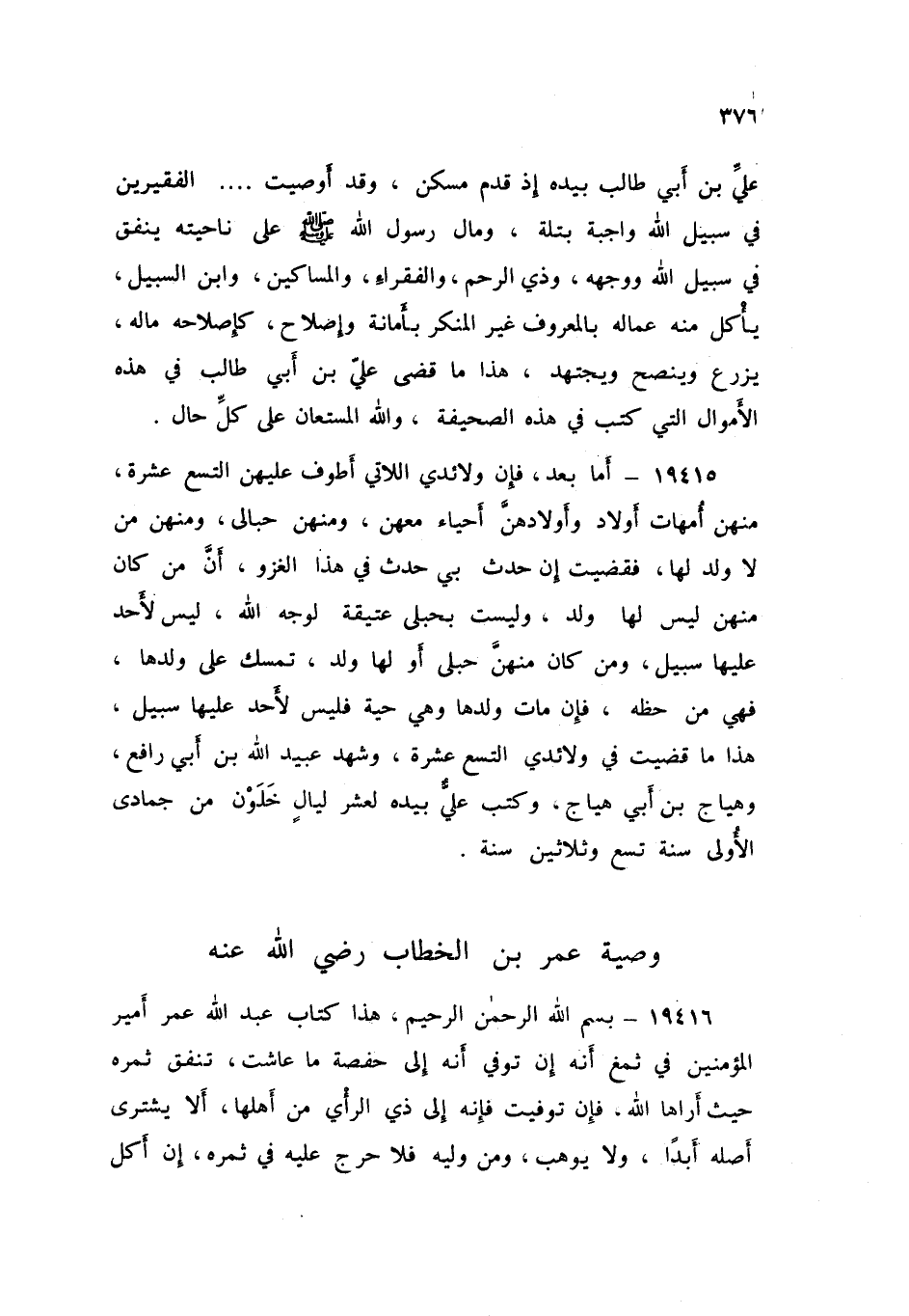 19416 - بِسْمِ اللَّهِ الرَّحْمَنِ الرَّحِيمِ هَذَا §كِتَابُ عَبْدِ اللَّهِ عُمَرَ أَمِيرِ الْمُؤْمِنِينَ فِي ثَمْغٍ أَنَّهُ إِنْ تُوُفِّيَ أَنَّهُ إِلَى حَفْصَةَ مَا عَاشَتْ , تُنْفِقُ ثَمَرَهُ حَيْثُ أَرَاهَا اللَّهُ , فَإِنْ تُوُفِّيَتْ فَإِنَّهُ إِلَى ذِي الرَّأْيِ مِنْ أَهْلِهَا , أَلَّا يَشْتَرِيَ أَصْلَهُ أَبَدًا , وَلَا يُوهَبَ , وَمَنْ وَلِيَهُ فَلَا حَرَجَ عَلَيْهِ فِي ثَمَرِهِ , إِنْ أَكَلَ -[377]- أَوْ آكَلَ صَدِيقًا غَيْرَ مُتَمَوِّلٍ مِنْهُ مَالًا , فَمَا عَفَا عَنْهُ مِنْ ثَمَرِهِ فَهُو لِلسَّائِلِ , وَالْمَحْرُومِ , وَالنَّسِيفِ , وَذِي الْقُرْبَى , وَابْنِ السَّبِيلِ , وَفِي سَبِيلِ اللَّهِ , يُنْفِقُهُ حَيْثُ أَرَاهُ اللَّهُ مِنْ ذَلِكَ , وَإِنْ تُوُفِّيَتُ , وَمِائَةُ الْوَسْقِ الَّذِي أَطْعَمَنِي مُحَمَّدٌ صَلَّى اللهُ عَلَيْهِ وَسَلَّمَ بِالْوَادِي بِيَدِي , لَمْ أُهْلِكْهَا , فَإِنَّهَا مَعَ ثَمْغٍ عَلَى السُّنَّةِ الَّتِي أَمَرْتُ بِهَا , وَإِنْ شَاءَ وَلِيُّ ثَمْغٍ اشْتَرَى مِنْ ثَمَرِهِ رَقِيقًا لِعَمَلِهِ , وَكَتَبَ مُعَيْقِيبٌ وَشَهِدَ عَبْدُ اللَّهِ بْنُ الْأَرْقَمِ»