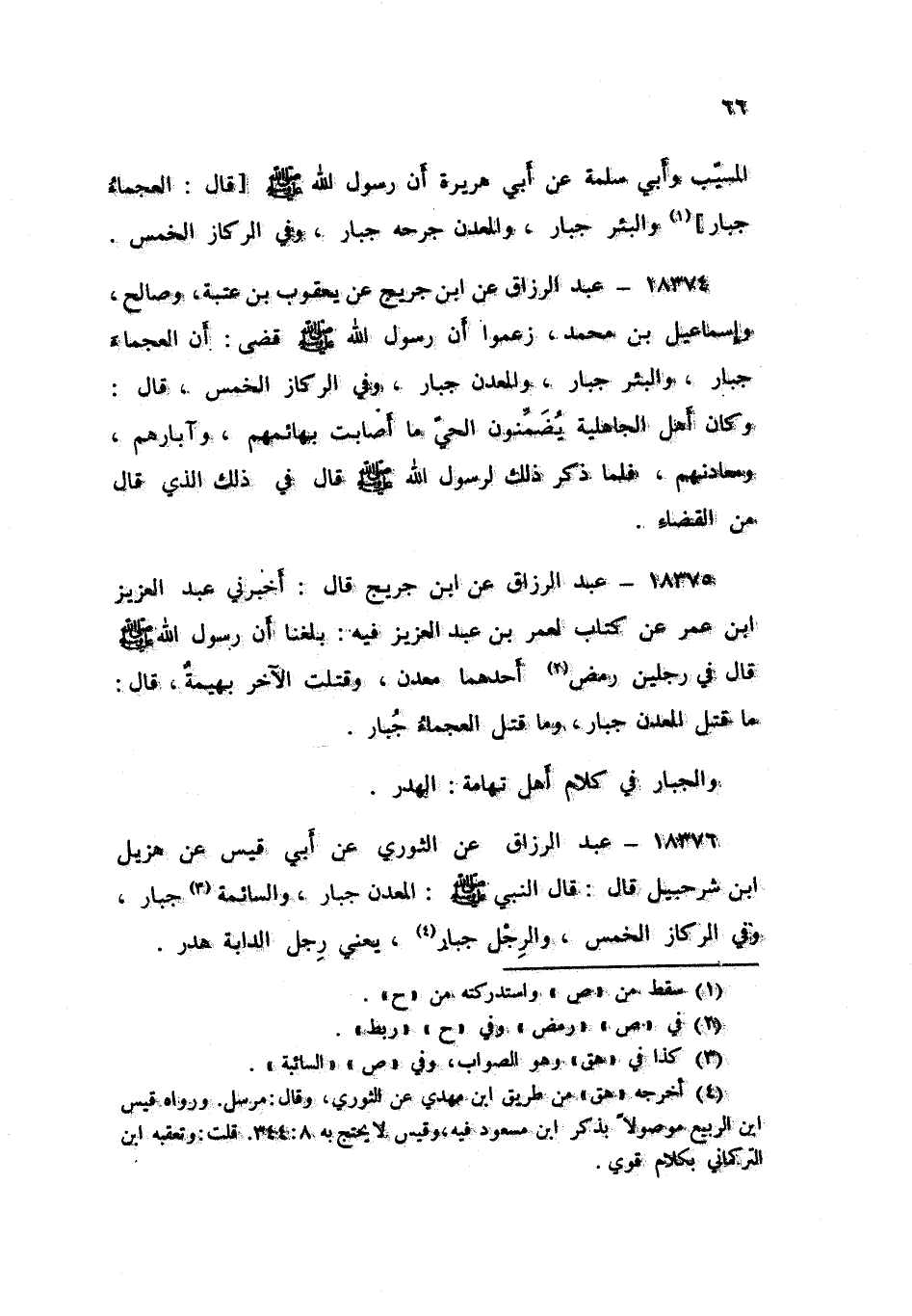 18376 - عَنِ الثَّوْرِيِّ , عَنْ أَبِي قَيْسٍ , عَنْ هُزَيْلِ بْنِ شُرَحْبِيلَ , قَالَ: قَالَ النَّبِيُّ صَلَّى اللهُ عَلَيْهِ وَسَلَّمَ: «§الْمَعْدِنُ جُبَارٌ , وَالسَّائِمَةُ جُبَارٌ , وَفِي الرِّكَازِ الْخُمُسُ , وَالرِّجْلُ جُبَارٌ» - يَعْنِي رِجْلَ الدَّابَّةِ هَدْرٌ -