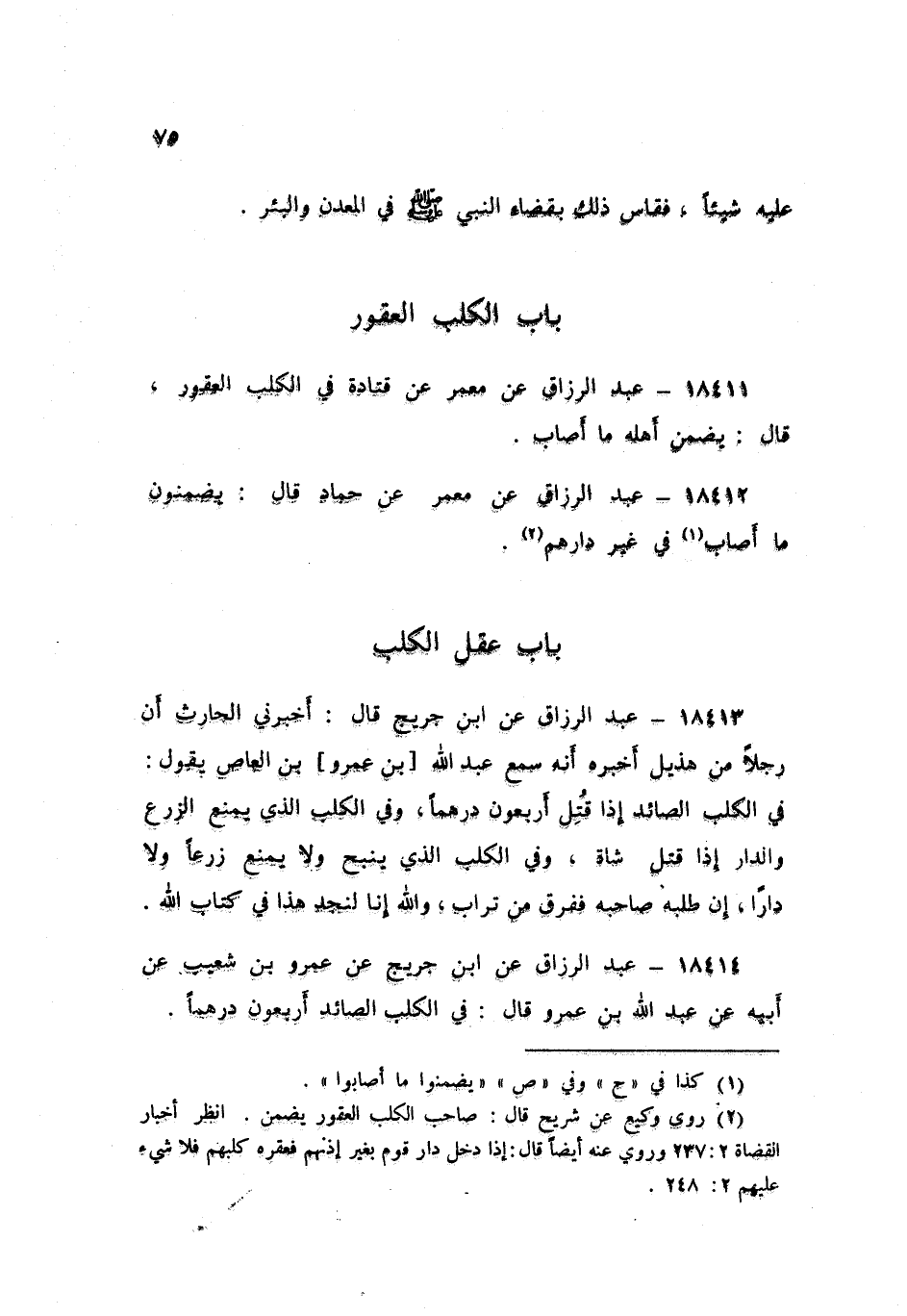 18413 - عَنِ ابْنِ جُرَيْجٍ , قَالَ: أَخْبَرَنِي الْحَارِثُ , أَنَّ رَجُلًا مِنْ هُذَيْلٍ أَخْبَرَهُ أَنَّهُ سَمِعَ عَبْدَ اللَّهِ بْنَ عَمْرِو بْنِ الْعَاصِ يَقُولُ: «فِي §الْكَلْبِ الصَّائِدِ إِذَا قُتِلَ أَرْبَعُونَ دِرْهَمًا , وَفِي الْكَلْبِ الَّذِي يَمْنَعُ الزَّرْعَ وَالدَّارَ إِذَا قَتَلَ شَاةً , وَفِي الْكَلْبِ الَّذِي يَنْبَحُ وَلَا يَمْنَعُ زَرْعًا وَلَا دَارًا , إِنْ طَلَبَهُ صَاحِبُهُ فَفَرَقٌ مِنْ تُرَابٍ وَاللَّهِ إِنَّا لَنَجِدُ هَذَا فِي كِتَابِ اللَّهِ»