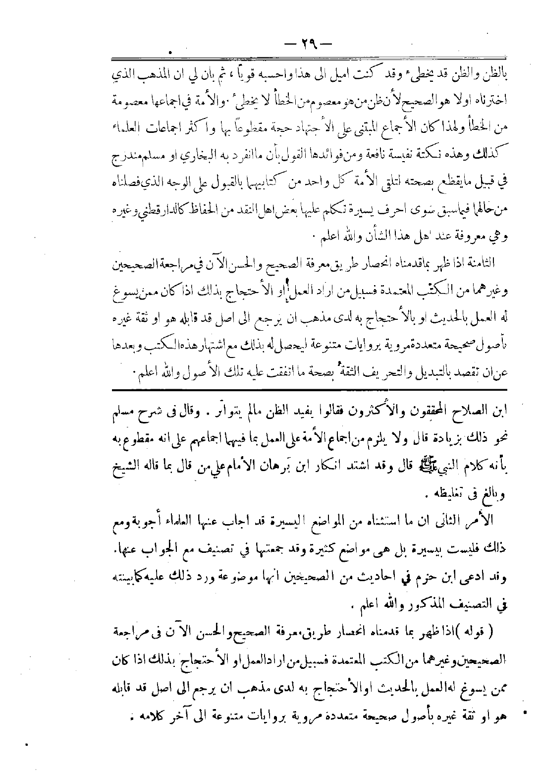 الثَّامِنَةُ: إِذَا ظَهَرَ بِمَا قَدَّمْنَاهُ انْحِصَارُ طَرِيقِ مَعْرِفَةِ الصَّحِيحِ وَالْحَسَنِ الْآنَ فِي مُرَاجَعَةِ الصَّحِيحَيْنِ وَغَيْرِهِمَا مِنَ الْكُتُبِ الْمُعْتَمَدَةِ، فَسَبِيلُ مَنْ أَرَادَ الْعَمَلَ أَوِ الِاحْتِجَاجَ بِذَلِكَ - إِذَا كَانَ مِمَّنْ يَسُوغُ لَهُ الْعَمَلُ بِالْحَدِيثِ، أَوِ الِاحْتِجَاجُ بِهِ لِذِي مَذْهَبٍ - أَنْ يَرْجِعَ إِلَى أَصْلٍ قَدْ قَابَلَهُ هُوَ أَوْ ثِقَةٍ غَيْرِهِ بِأُصُولٍ صَحِيحَةٍ مُتَعَدِّدَةٍ، مَرْوِيَّةٍ بِرِوَايَاتٍ مُتَنَوِّعَةٍ، لِيَحْصُلَ لَهُ بِذَلِكَ - مَعَ اشْتِهَارِ هَذِهِ الْكُتُبِ وَبُعْدِهَا عَنْ أَنْ تُقْصَدَ بِالتَّبْدِيلِ وَالتَّحْرِيفِ - الثِّقَةُ بِصِحَّةِ مَا اتَّفَقَتْ عَلَيْهِ تِلْكَ الْأُصُولُ، وَاللَّهُ أَعْلَمُ.