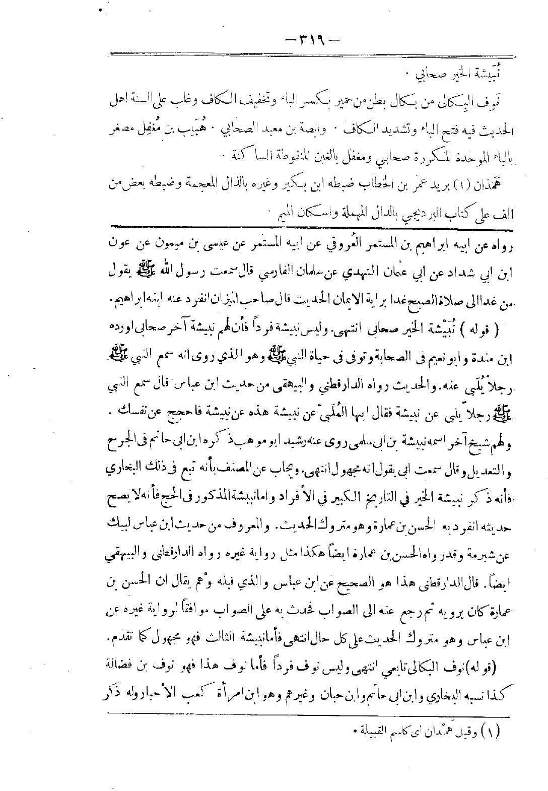 وَلِمُسْلِمٍ فِيهِ كِتَابٌ لَمْ أَرَهُ، وَمِثَالُهُ مِنَ الصَّحَابَةِ وَهْبُ بْنُ خَنْبَشٍ - وَهُوَ فِي كِتَابَيِ الْحَاكِمِ وَأَبِي نُعَيْمٍ الْأَصْبَهَانِيِّ فِي مَعْرِفَةِ عُلُومِ الْحَدِيثِ هَرِمُ بْنُ خَنْبَشٍ، وَهُوَ رِوَايَةُ دَاوُدَ الْأَوْدِيِّ عَنِ الشَّعْبِيِّ، وَذَلِكَ خَطَأٌ - صَحَابِيٌّ لَمْ يَرْوِ عَنْهُ غَيْرُ الشَّعْبِيِّ.