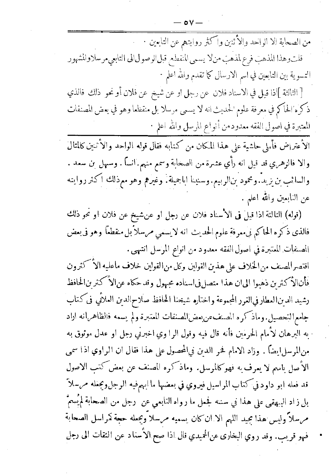 أَنْوَاعِ عُلُومِ الْحَدِيثِ) مِنْ أَنَّ الْمُرْسَلَ مَخْصُوصٌ بِالتَّابِعِيِّ، وَأَنَّ الْمُنْقَطِعَ مِنْهُ الْإِسْنَادُ فِيهِ قَبْلَ الْوُصُولِ إِلَى التَّابِعِيِّ رَاوٍ لَمْ يَسْمَعْ مِنَ الَّذِي فَوْقَهُ، وَالسَّاقِطُ بَيْنَهُمَا غَيْرُ مَذْكُورٍ، لَا مُعَيَّنًا وَلَا مُبْهَمًا، وَمِنْهُ: الْإِسْنَادُ الَّذِي ذُكِرَ فِيهِ بَعْضُ رُوَاتِهِ بِلَفْظٍ مُبْهَمٍ نَحْوَ رَجُلٍ، أَوْ شَيْخٍ، أَوْ غَيْرِهِمَا.