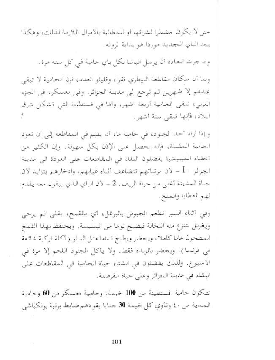 وإذا أراد أحد الجنود، في حامية ما، أن يقيم في المقاطعة إلى أن تعود الحامية المقبلة، فإنه يحصل على الإذن بكل سهولة. وإن الكثير من أعضاء الميليشيا يفضلون البقاء في المقاطعات على العودة إلى مدينة الجزائر: