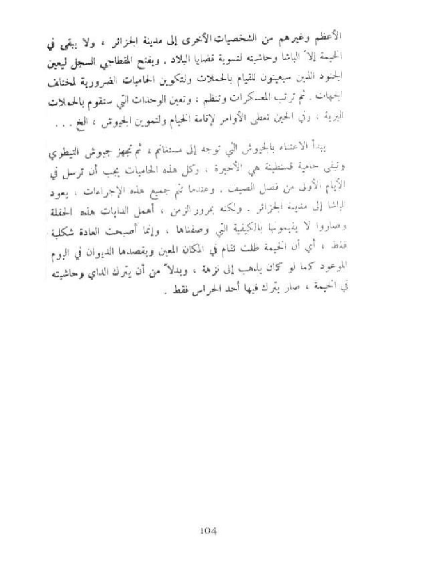 الأعظم وغيرهم من الشخصيات الأخرى إلى مدينة الجزائر، ولا يبقى في الخيمة إلا والباشا وحاشيته لتسوية قضايا البلاد , ويفتح المقطاجي السجل ليعين الجنود الذين سيعينون للقيام بالحملات ولتكوين الحاميات الضرورية لمختلف الجهات. ثم ترتب المعسكرات وتنظم، وتعين الوحدات التي ستقوم بالحملات البرية، وفي الحين تعطى الأوامر لإقامة الخيام ولتموين الجيوش، الخ ...