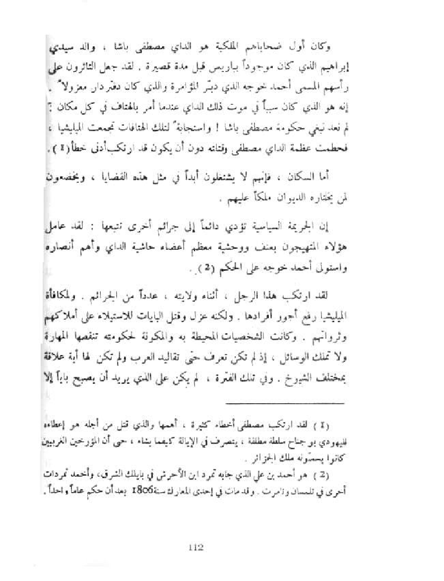 وكان أول ضحاياهم الملكية هو الداي مصطفى باشا، والد سيدي إبراهيم الذي كان موجودا بباريس قبل مدة قصيرة. لقد جعل الثائرون على رأسهم المسمى أحمد خوجه الذي دبر المؤارة والذي كان دفتر دار معزولا. إنه هو الذي كان سببا في موت ذلك الداي عندما أمر بالهتاف في كل مكان لم نعد نبغي حكومة مصطفى باشا! واستجابة لتلك الهتافات تجمعت الميليشيا، فحطمت عظمة الداي مصطفى وقتلته دون أن يكون قد ارتكب أدنى خطأ (¬1).
