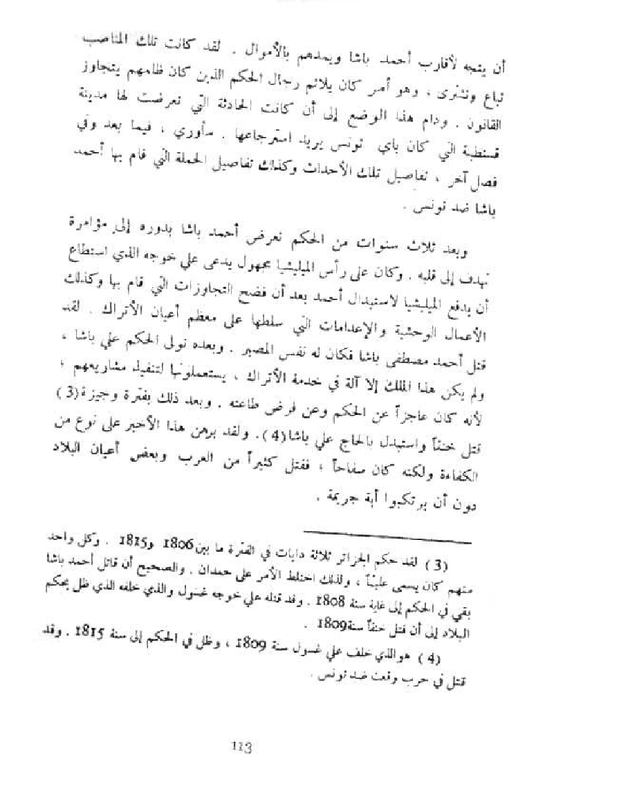 وبعد ثلاث سنوات من الحكم تعرض أحمد باشا بدوره إلى مؤامرة تهدف إلى قلبه. وكان على رأس الميليشيا مجهول يدعى علي خوجه الذي استطاع أن يدفع الميليشيا لاستبدال أحمد بعد أن فضح التجاوزات التي قام بها وكذلك الأعمال الوحشية والإعدامات التي سلطها على معظم أعيان الأتراك. لقد قتل أحمد مصطفى باشا فكان له نفس المصير. وبعده تولى الحكم علي باشا، ولم يكن هذا الملك إلا آلة في خدمة الأتراك، يستعملونها لتنفيد مشاريعهم، لأنه كان عاجزا عن الحكم وعن فرض طاعته. وبعد ذلك بفترة وجيزة (¬3) قتل خنقا واستبدل بالحاج علي باشا (¬4). ولقد برهن هذا الأخير على نوع من الكفاءة ولكنه كان سفاحا، فقتل كثيرا من العرب وبعض أعيان البلاد دون أن يرتكبوا أية جريمة.