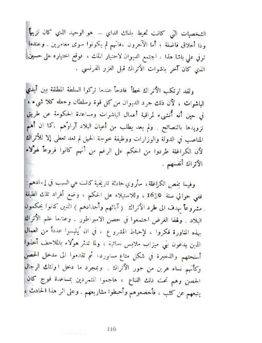 ولقد ارتكب الأتراك خطأ فادحا عندما تركوا السلطة المطلقة بين أيدي الباشوات، لأن ذلك جرد الديوان من كل قوة وسلطان وجعله كلا شيء، في حين أنه أنشىء لمراقبه أعمال الباشوات ومساعدة الحكومة عن طريق تزويدها بالنصائح. ولم يعد يطلب من أعيان البلاد آراؤهم، كما ان أهم المناصب في الدولة والوزارات ووظيفة خوجة الخيل لم تعد تعطى إلا للأتراك لأن الكراغلة طردوا من الحكم على الرغم من أنهم كانوا فروعا لهؤلاء الأتراك أنفسهم.