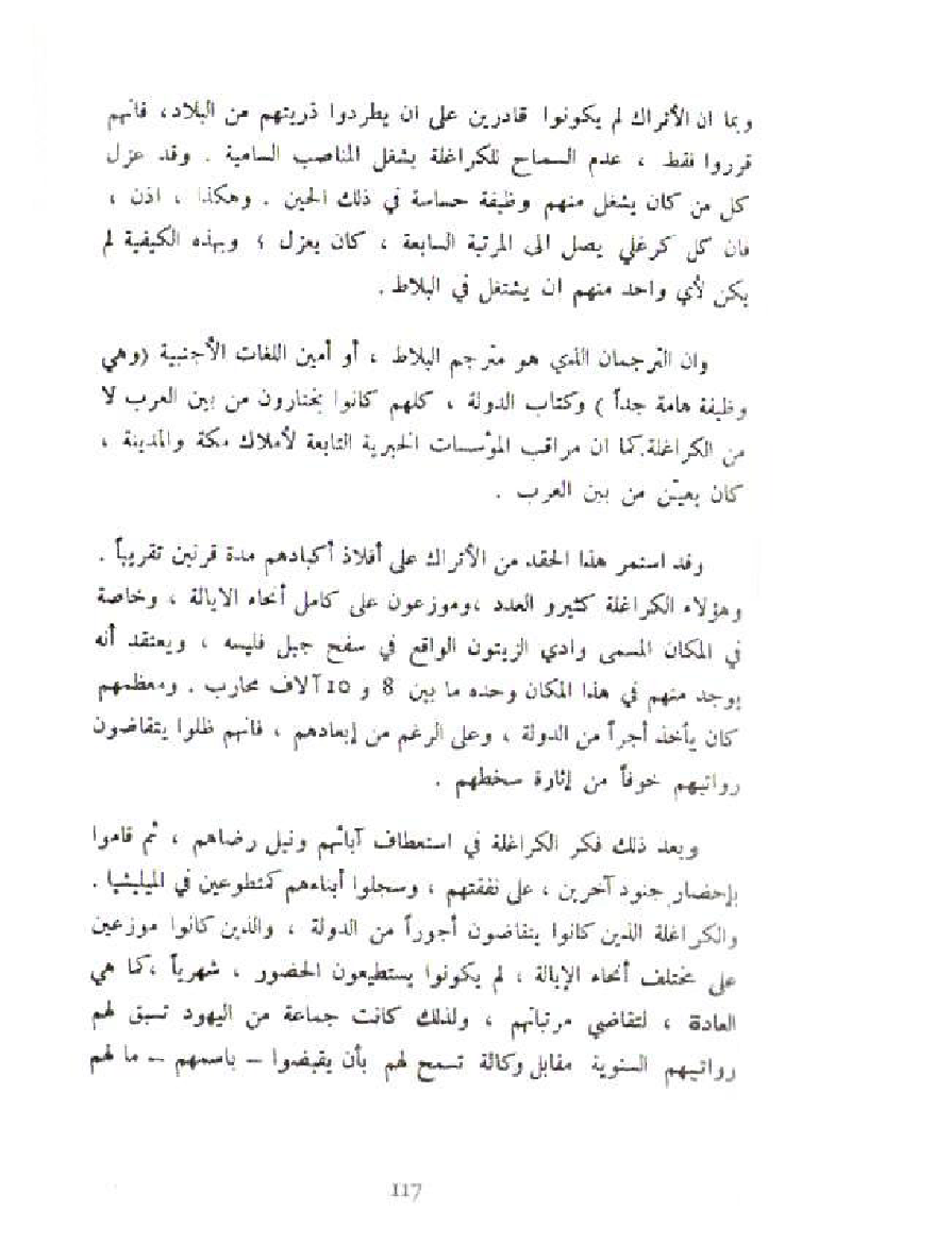 وان الترجمان الذي هو مترجم البلاط، أو أمين اللغات الأجنبية (وهي وظيفة هامة جدا) وكتاب الدولة، كلهم كانوا يختارون من بين العرب لا من الكراغلة كما ان مراقب المؤاسسات الخيرية التابعة لأملاك مكة والمدينة، كان يعين من بين العرب.
