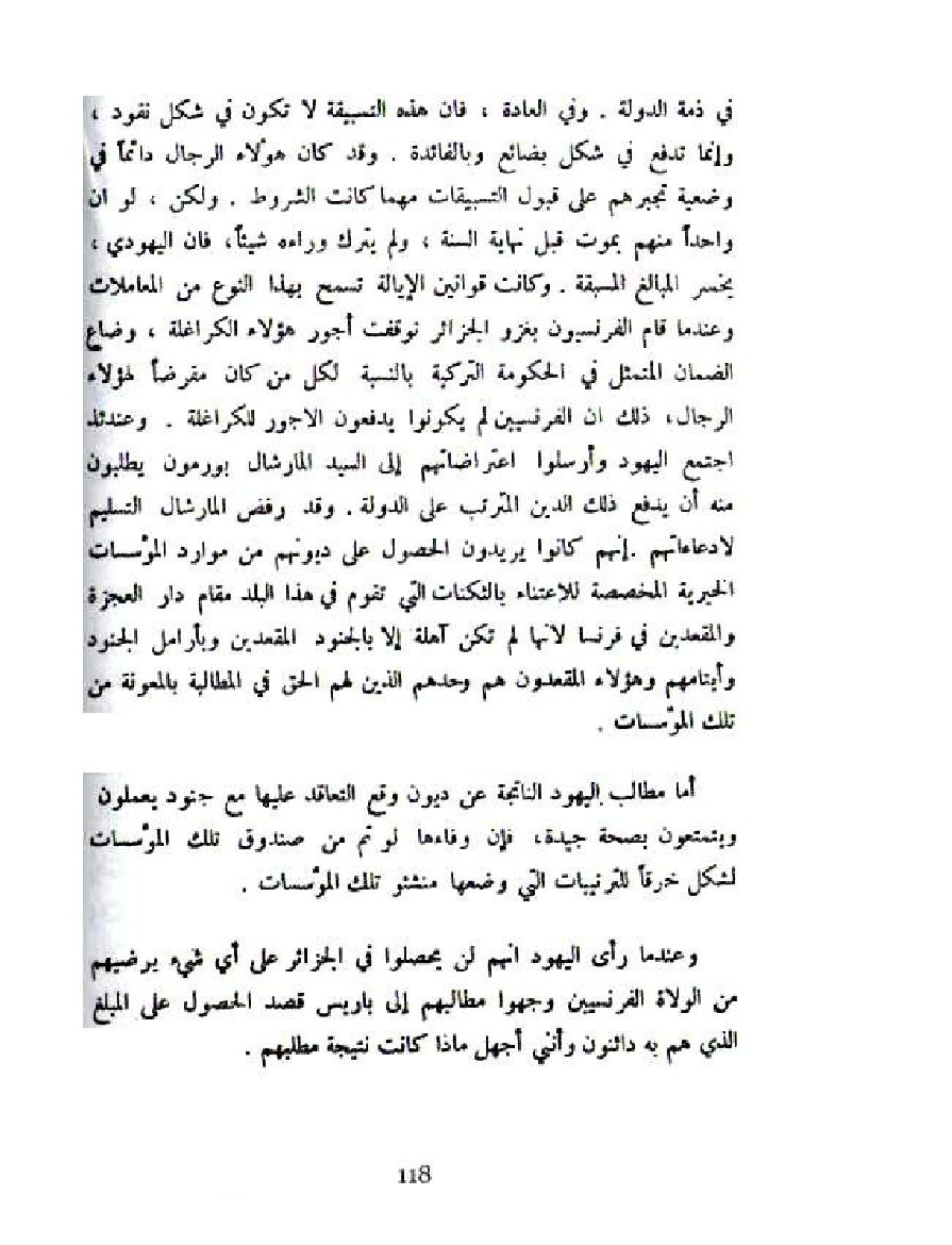 في ذمة الدولة. وفي العادة، فان هذه التسبيقة لا تكون في شكل نفود، وإنما تدفع في شكل بضائع وبالفائدة. وقد كان هؤلاء الرجال دائما في وضعية تجبرهم على قبول التسبيقات مهماكانت الشروط. ولكن، لو ان واحدا منهم يموت قبل نهاية السنة، ولم يترك وراءه شيئا، فان اليهودي، يخسر المبالغ المسبقة. وكانت قوانين الإيالة تسمح بهذا النوع من المعاملات وعندما قام الفرنسيون بغزو الجزائر توقفت أجور هؤلاء الكراغلة، وضاع الضمان المثمثل في الحكومة التركية بالنسبة لكل من كان مقرضا لهؤلاء الرجال، ذلك ان الفرنسيين لم يكونوا يدفعون الاجور للكراغلة. وعندئذ اجتمع اليهود وأرسلوا اعتراضاتهم إلى السيد المارشال بورمون يطلبون منه أن يدفع ذلك الدين المترتب على الدولة. وقد رفض المارشال التسليم لادعاءاتهم. إنهم كانوا يريدون الحصول على ديونهم من موارد المؤسسات الخيرية المخصصة للاعتناء بالثكنات التي تقوم في هذا البلد مقام دار العجزة والمقعدين في فرنسا لانها لم تكن آهلة إلا بالجنود المقعدين وبأرامل الجنود وأيتامهم وهؤلاء المقعدون هم وحدهم الذين لهم الحق في المطالبة بالمعونة من تلك المؤسسات.