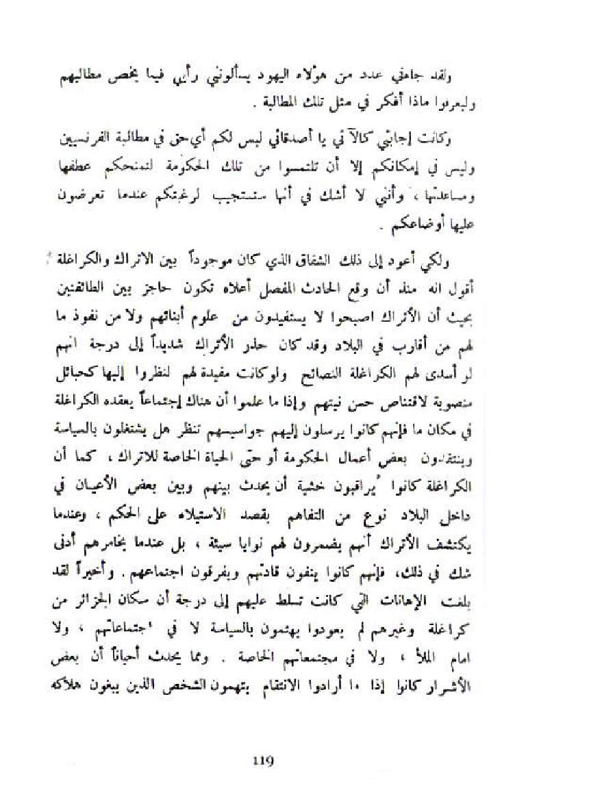 ولكي أعود إلى ذلك الشقاق الذي كان موجودا بين الأتراك والكراغلة أقول انه منذ أن وقع الحادث المفصل أعلاه تكون حاجز بين الطائفتين بحيث أن الأتراك أصبحوا لا يستفيدون من علوم أبنائهم ولا من نفوذ ما لهم من أقارب في البلاد وقد كان حذر الأتراك شديدا إلى درجة أنهم لو أسدى لهم الكراغلة النصائح ولو كانت مفيدة لهم لنظروا إليها كحبائل منصوبة لاقتناص حسن نيتهم وإذا ما علموا أن هناك اجتماعا يعقده الكراغلة في مكان ما فإنهم كانوا يرسلون إليهم جواسيسهم تنظر هل يشتغلون بالسياسة وينتقدون بعض أعمال الحكومة أو حتى الحياة الخاصة للأتراك، كما أن الكراغلة كانوا يراقبون خشية أن يحدث بينهم وبين بعض الأعيان في داخل البلاد نوع من التفاهم بقصد الاستيلاء على الحكم، وعندما يكتشف الأتراك أنهم يضمرون لهم نوايا سيئة، بل عندما يخامرهم أدنى شك في ذلك، فإنهم كانوا ينفون قادتم ويفرقون اجتماعهم. وأخيرا لقد بلغت الإهانات التي كانت تسلط عليهم إلى درجة أن سكان الجزائر من كراغلة وغيرهم لم يعودوا يهتمون بالسياسة لا في اجتماعامم، ولا امام الملأ، ولا في مجتمعاتهم الخاصة. ومما يحدث أحيانا أن بعض الأشرار كنوا إذا ما أرادوا الانتقام يتهمون الشخص الذين يبغون هلاكه