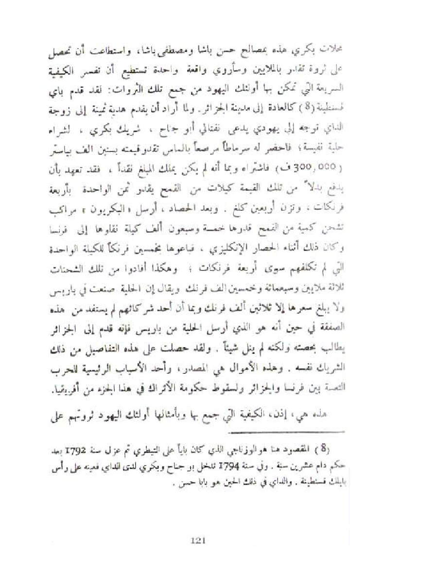 محلات بكري هذه بمصالح حسن باشا ومصطفى باشا، واستطاعت أن تحصل على ثروة تقدر بالملايين وسأروي واقعة واحدة تستطيع أن تفسر الكيفية السريعة التي تمكن بها أولئك اليهود من جمع تلك الثروات: لقد قدم باي قسنطينة (¬8) كالعادة إلى مدينة الجزائر. ولما أراد أن يقدم هدية ثمينة إلى زوجة الداي توجه إلى يهودي يدعى نفتالي أبو جناح، شريك بكري، لشراء حلية نفيسة، فأحضر له سرماطا مرصعا بالماس تقدر قيمته بستين ألف بياستر (300،000 ف) فاشتراه وبما أنه لم يكن يملك المبلغ نقدا، فقد تعهد بأن يدفع بدلا من تلك القيمة كيلات من القمح يقدر ثمن الواحدة بأربعة فرنكات، وتزن أربعين كلغ. وبعد الحصاد، أرسل (البكريون) مراكب تشحن كمية من القمح قدرها خمسة وسبعون ألف كيلة نقلوها إلى فرنسا وكان ذلك أثناء الحصار الإنكليزي، فباعوها بخمسة فرنكا للكيلة الواحدة التي لم تكلفهم سوى أربعة فرنكات، وهكذا افادوا من تلك الشحنات ثلاثة ملايين وسبعمائة وخمسين ألف فرنك ويقال إن الحلية صنعت في باريس ولا يبلغ سعرها إلا ثلاثين ألف فرنك وبما أن أحد شركائهم لم يستفد من هذه الصفقة في حين أنه هو الذي أرسل الحلية من باريس فإنه قدم إلى الجزائر يطالب بحصته ولكنه لم ينل شيئا. ولقد حصلت على هذه التفاصيل من ذلك الشريك نفسه. وهذه الأموال هي المصدر، وأحد الأسباب الرئيسية للحرب التعسة بين فرنسا والجزائر ولسقوط حكومة الأتراك في هذا الجزء من أفريقيا.