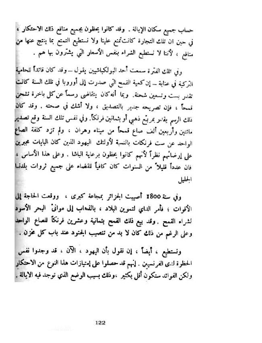 وفي سنة 1800 أصيبت الجزائر بمجاعة كبرى، ووقعت الحاجة إلى الأقوات، فأمر الداي لتموين البلاد، بالذهاب إلى موانئ البحر الأسود لشراء القمح. وقد بيع ذلك القمح بثمانية وعشرين فرنكا للصاع الواحد وعلى الرغم من ذلك كان لا بد من تنصيب الجنود عند باب كل مخزن. ونستطيع، أيضا، أن نقول بأن اليهود، الآن، قد وجدوا نفس الحظوة لدى الفرنسيين. إنهم قد حصلوا على إمتيازات هذا النوع من الاحتكار ولكن الفوائد ستكون أقل بكثير، وذلك بسبب الوضع الذي توجد فيه الايالة.