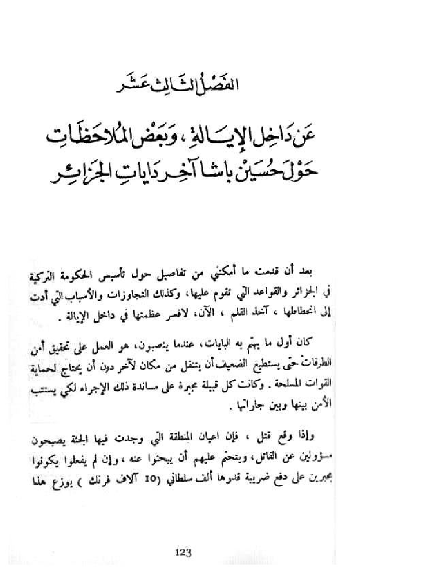بعد أن قدمت ما أمكنني من تفاصيل حول تأسيس الحكومة التركية في الجزائر والقواعد التي تقوم عليها، وكذلك التجاوزات والأسباب التي أدت إلى انحطاطها، آخذ القلم، الآن، لأفسر عظمتها في داخل الإيالة.