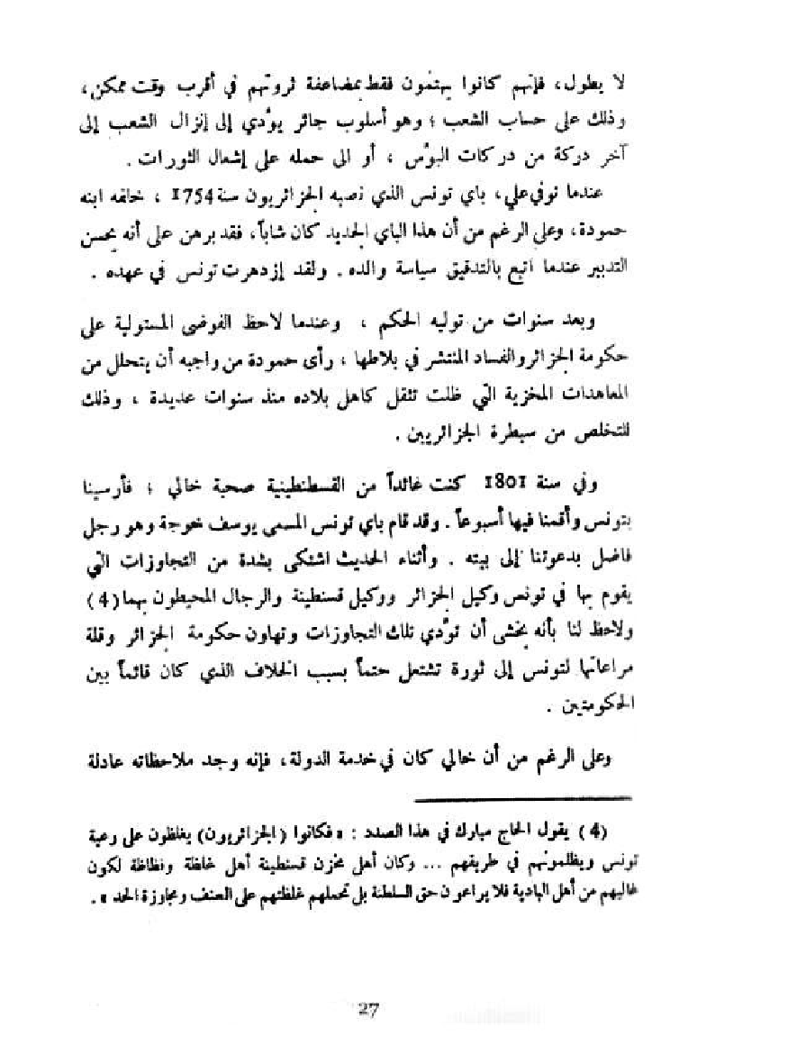 وفي سنة 1801 كنت عائدا من القسطنطينية صحبة خالي؛ فأرسينا بتونس وأقمنا فيها أسبوعا. وقد قام باي تونس المسمى يوسف خوجة وهو رجل فاضل بدعوتنا إلى بيته. وأثناء الحديث اشتكى بشدة من التجاوزات التي يقوم بها في تونس وكيل الجزائر ووكيل قسنطينة والرجال المحيطون بهما (¬4) ولاحظ لنا بأنه يخشى أن تؤدي تلك التجاوزات وتهاون حكومة الجزائر وقلة مراعاتها لتونس إلى ثورة تشتعل حتما بسبب الخلاف الذي كان قائما بين الحكومتين.