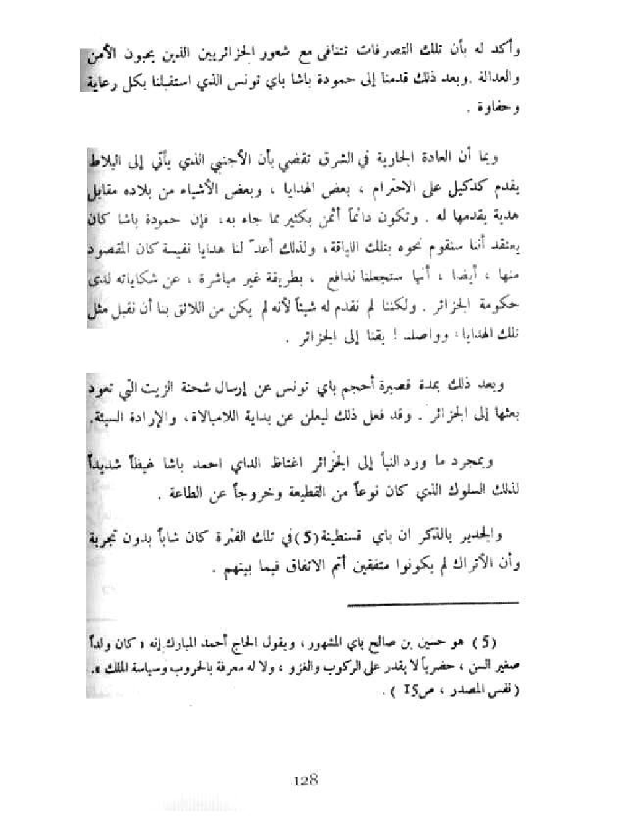 وأكد له بأن تلك التصرفات تتنافى مع شعور الجزائريين الذين يحبون الأمن والعدالة. وبعد ذلك قدمنا إلى حمودة باشا باي تونس الذي استقبلنا بكل رعاية وحفاوة.