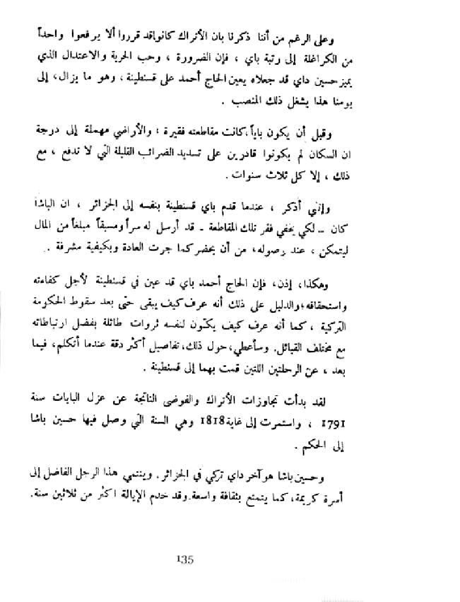 وإنني أذكر، عندما قدم باي قسنطينة بنفسه إلى الجزائر، أن الباشا كان - لكي يخفي فقر تلك المقاطعة - قد أرسل له سرا ومسبقا مبلغا من المال ليتمكن، عند وصوله، من أن يحضر كما جرت العادة وبكيفية مشرفة.