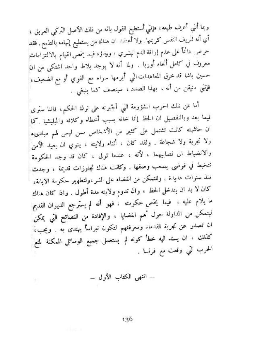 أما عن تلك الحرب المشؤومة التي أجبرته على ترك الحكم، فإننا سنرى فيما بعد وبالتفصيل أن الحظ إنما خانه بسبب أخطاء وكلائه والميليشيا. كما أن حاشيته كانت تشتمل على كثير من الأشخاص ممن ليس لهم مبادىء ولا تجربة ولا شجاعة. ولقد كان، أثناء ولايته، ينوي أن يعيد الأمن والانضباط إلى نصابيهما، لأنه، عندما تولى، كان قد وجد الحكومة تتخبط في فوضى يصعب وصفها. وكانت هناك تجاوزات قديمة، وجدت منذ سنوات عديدة. وللتمكن من القضاء على الشر، ولتطهير حكومة الإيالة، كان لا بد أن يتدخل الحظ، وأن تدوم ولايته مدة أطول. وإذا كان هناك ما يلام عليه، فيما يخص حكومته، فهو أنه لم يسترجع الديوان القديم ليتمكن من المداولة حول أهم القضايا، والإفادة من النصائح التي يمكن أن تصدر عن تجربة القدماء ومعرفتهم لتكون نبراسا يهتدى به. ويجب، كذلك، ان يسند إليه خطأ كونه لم يستعمل جميع الوسائل الممكنة لمنع الحرب التي وقعت مع فرنسا.