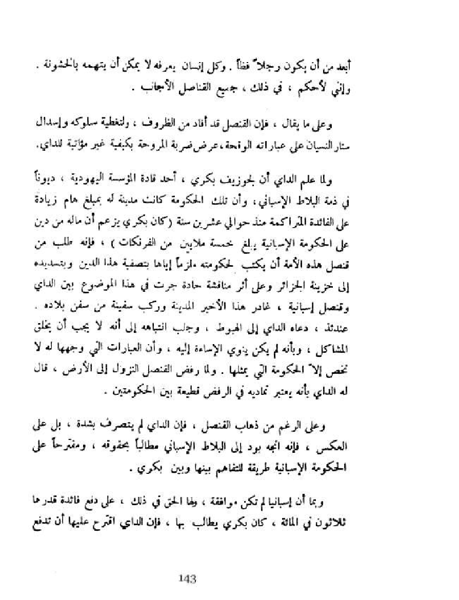 وبما أن إسبانيا لم تكن موافقة، ولها الحق في ذلك، على دفع فائدة قدرها ثلاثون في المائة، كان بكري يطالب بها، فإن الداي اقترح عليها أن تدفع