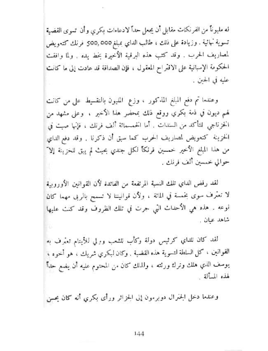 لقد رفض الداي تلك النسبة المرتفعة من الفائدة لأن القوانين الأوروبية لا تعرف سوى بخمسة في المائة، ولأن قوانيننا لا تسمح بالربى مهما كان نوعه. هذه هي الأحداث التي جرت في تلك الظروف وقد كنت عليها شاهد عيان.
