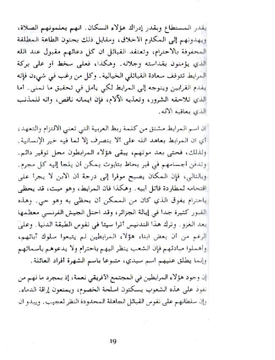 إن وجود هؤلاء المرابطين في المجتمع الأفريقي نعمة، إذ بمجرد ما لهم من نفوذ على هذه الشعوب يسكتون أسلحة الخصوم، ويمنعون إراقة الدماء. وإن سلظانهم على نفوس القبائل الجاهلة المحدودة النظر لعجيب. ويبدو أن