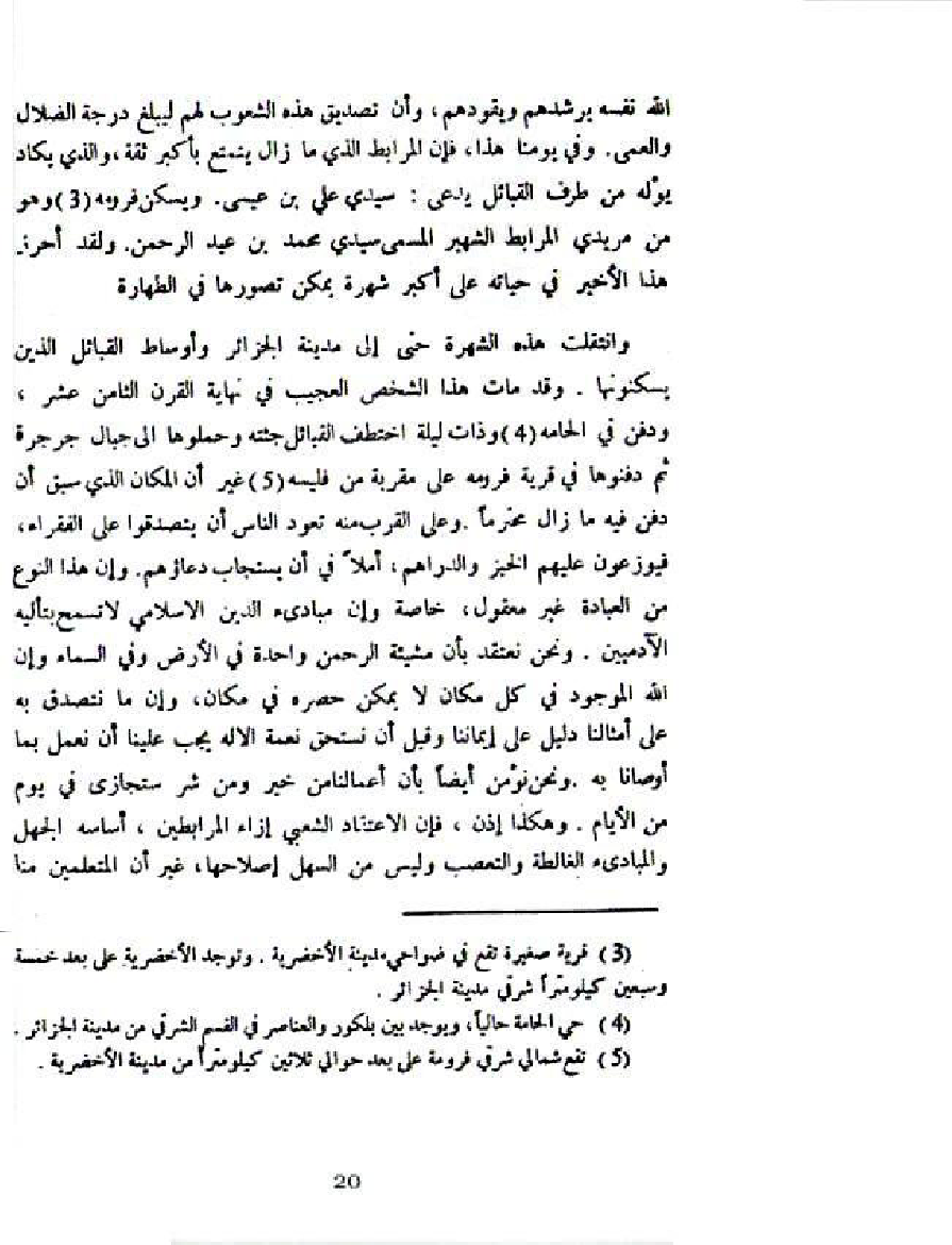 وانتقلت هذه الشهرة حتى إلى مدينة الجزائر وأواسط القبائل الذين يسكنونها. وقد مات هذا الشخص العجيب في نهاية القرن الثامن عشر، ودفن في الحامه (¬4) وذات ليلة اختطف القبائل جثته وحملوها إلى جبال جرجرة ثم دفنوها في قرية فرومة على مقربة من فليسه (¬5) غير أن المكان الذي سبق أن دفن فيه ما زال محترما. وعلى القرب منه تعود الناس أن يتصدقوا على الفقراء، فيوزعون عليهم الخبز والدراهم، أملا في أن يستجاب دعاؤهم. وإن هذا النوع من العبادة غير معقول، خاصة وإن مبادىء الدين الاسلامي لا تسمح بتأليه الآدميين. ونحن نعتقد بأن مشيئة الرحمن واحدة في الأرض وفي السماء وإن الله الموجود في كل مكان لا يمكن حصره في مكان، وإن ما نتصدق به على أمثالنا دليل على إيماننا وقبل أن نستحق نعمة الاله يجب علينا أن نعمل بما أوصانا به. ونحن نؤمن أيضا بأن أعالنا من خير ومن شر ستجازى في يوم من الأيام. وهكذا إذن، فإن الاعتقاد الشعبي إزاء المرابطين، أساسه الجهل والمبادىء الغالطة والتعصب وليس من السهل إصلاحها، غير أن المتعلمين منا