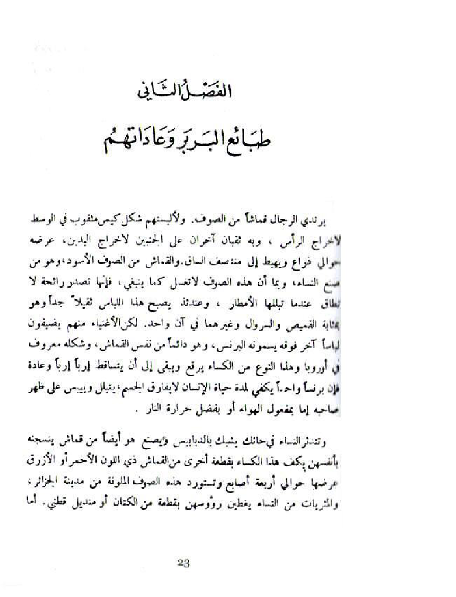 يرتدي الرجال قماشا من الصوف. ولأبستهم شكل كيس مثقوب في الوسط لإخراج الرأس، وبه ثقبان آخران على الجنبين لإخراج اليدين، عرضه حوالي ذارع ويهبط إلى منتصف الساق. والقماش من الصوف الأسود، وهو من صنع النساء، وبما أن هذه الصوف لا تغسل كما ينبغي، فإنها تصدر رائحة لا تطاف عندما تبللها الأمطار، وعندئذ يصبح هذا اللباس ثقيلا جدا وهو بمثابة القميص والسروال وغيرهما في آن واحد. لكن الأغنياء منهم يضيفون لباسا آخر فوقه يسمونه البرنس، وهو دئما من نفس القماش، وشكله معروف في أوروبا وهذا النوع من الكساء يرفع ويبقى إلى أن يتساقط إربا إربا وعادة فإن برنسا واحدا يكفي لمدة حياة الإنسان لا يفارق الجسم، يتبلل وييبس على ظهر صاحبه إما بمفعول الهواء أو بفضل حرارة النار.