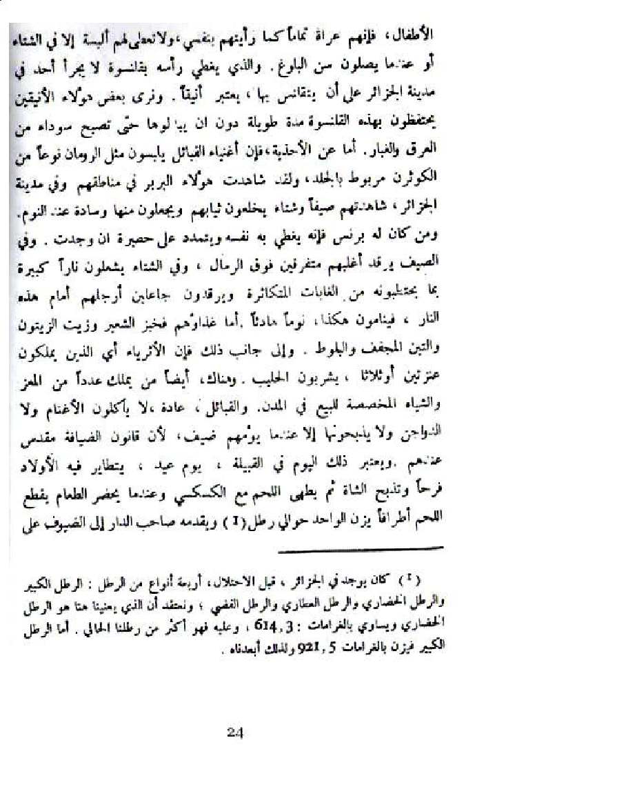 (¬1) كان يوجد في الجزائر، قبل الاحتلال، أربعة أنواع من الرطل: الرطل الكبير والرطل الخضاري والرطل العطاري والرطل الفضي، ونعتقد أن الذي يعنينا هنا هو الرطل الخضاري ويساوي بالغرامات: 614،3، وعليه فهو أكثر من رطلنا الحالي. أما الرطل الكبير فيزن بالغرامات 921،5 ولذلك أبعدناه.