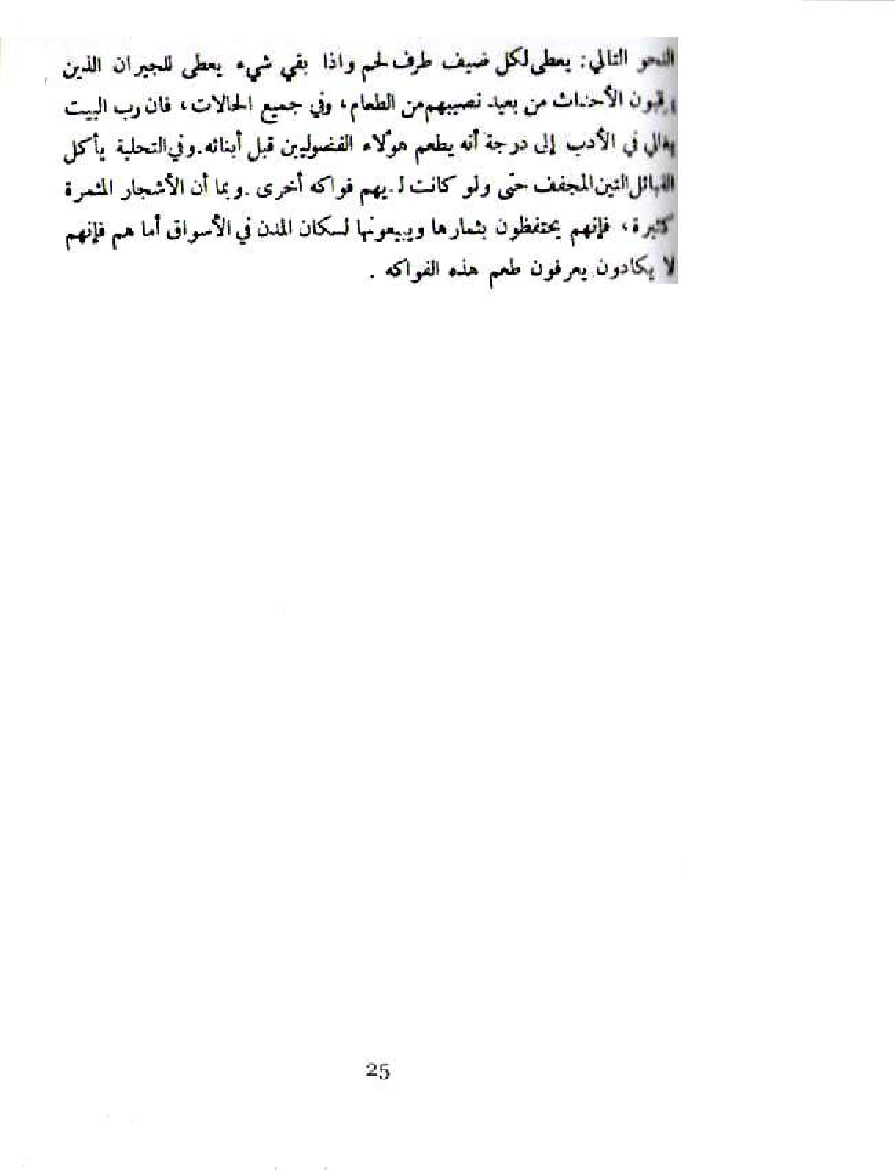 النحو التالي: يعطى لكل ضيف طرف لحم وإذا بقي شيء يعطى للجيران الذين يرقبون الأحداث من بعيد نصيبهم من الطعام، وفي جميع الحالات، فان رب البيت يغالي في الأدب إلى درجة أنه يطعم هؤلاء الفضوليين قبل أبنائه. وفي التحلية يأكل القبائل التين المجفف حتى ولو كانت لديهم فواكه أخرى. وبما أن الأشجار المثمرة كثيرة، فإنهم يحتفظون بثمارها ويبيعونها لسكان المدن في الأسواق أما هم فإنهم لا يكادون يعرفون طعم هذه الفواكه.