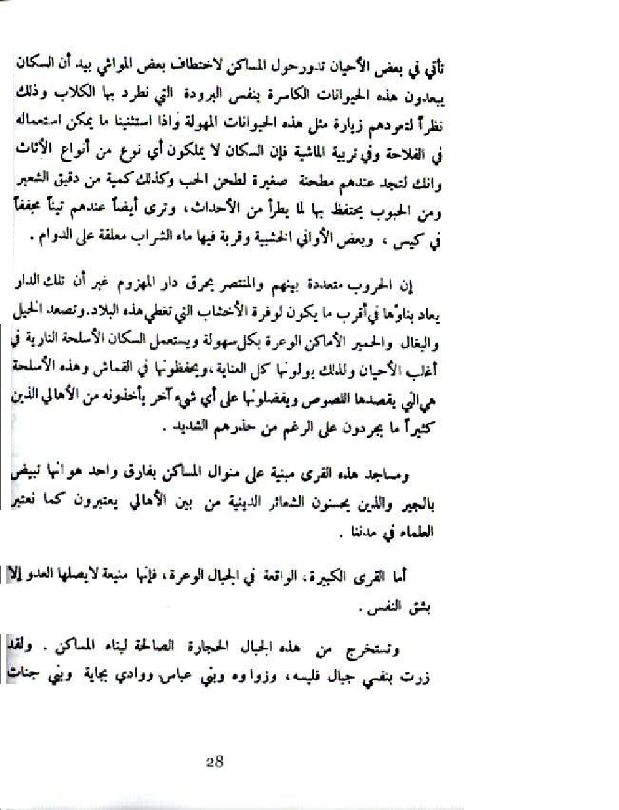 تأتي في بعض الأحيان تدور حول المساكن لاختطاف بعض المواشي بيد أن السكان يبعدون هذه الحيوانات الكاسرة بنفس البرودة التي نطرد بها الكلاب وذلك نظرا لتعودهم زيارة مثل هذه الحيوانات المهولة واذا استثنينا ما يمكن استعماله في الفلاحة وفي تربية الماشية فإن السكان لا يملكون أي نوع من أنواع الأثاث وانك لتجد عندهم مطحنة صغيرة لطحنن الحب وكذلك كمية من دقيق الشعير ومن الحبوب يحتفط بها لما يطرأ من الأحداث، وترى أيضا عندهم تينا مجففا في كيس، وبعض الأواني الخشبية وقربة فيها ماء الشراب معلقة على الدوام.