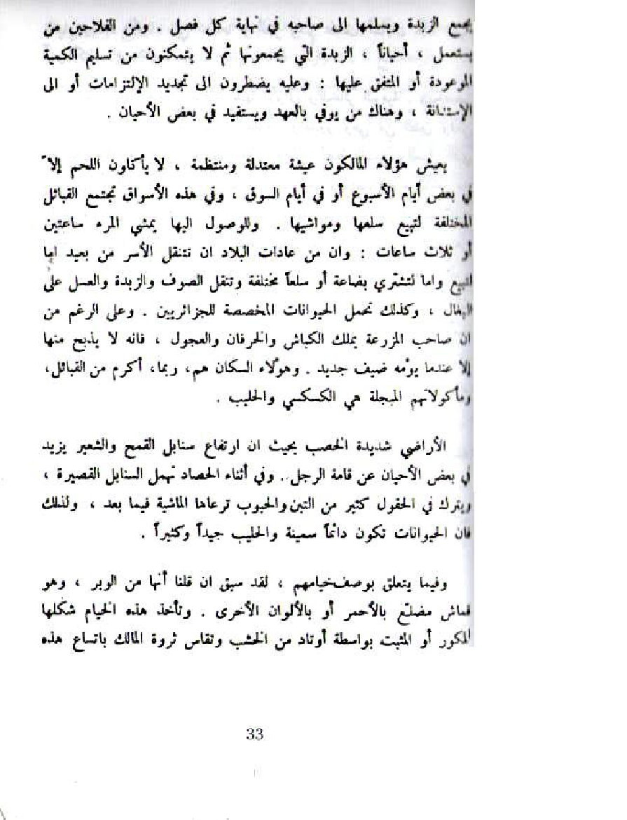 يعيش هؤلاء المالكون عيشة معتدلة ومنتظمة، لا يأكلون اللحم إلا في بعض أيام الأسبوع أو في أيام السوق، وفي هذه الأسواق تجتمع القبائل المختلفة لتبيع سلعها ومواشيها. للوصول إليها يمشي المرء ساعتين أو ثلاث ساعات: وان من عادات البلاد ان تتنقل الأسر من بعيد إما لتبيع وإما لتشتري بضاعة أو سلعا مختلفة وتنقل الصوف والزبدة والعسل على البغال، وكذلك تحمل الحيوانات المخصصة للجزائريين. وعلى الرغم من أن صاحب المزرعة يملك الكباش والخرفان والعجول، فانه لا يذبح منها إلا عندما يؤمه ضيف جديد. وهؤلاء السكان هم، ربما، أكرم من القبائل، ومأكولاتهم المبجلة هي الكسكسي والحليب.