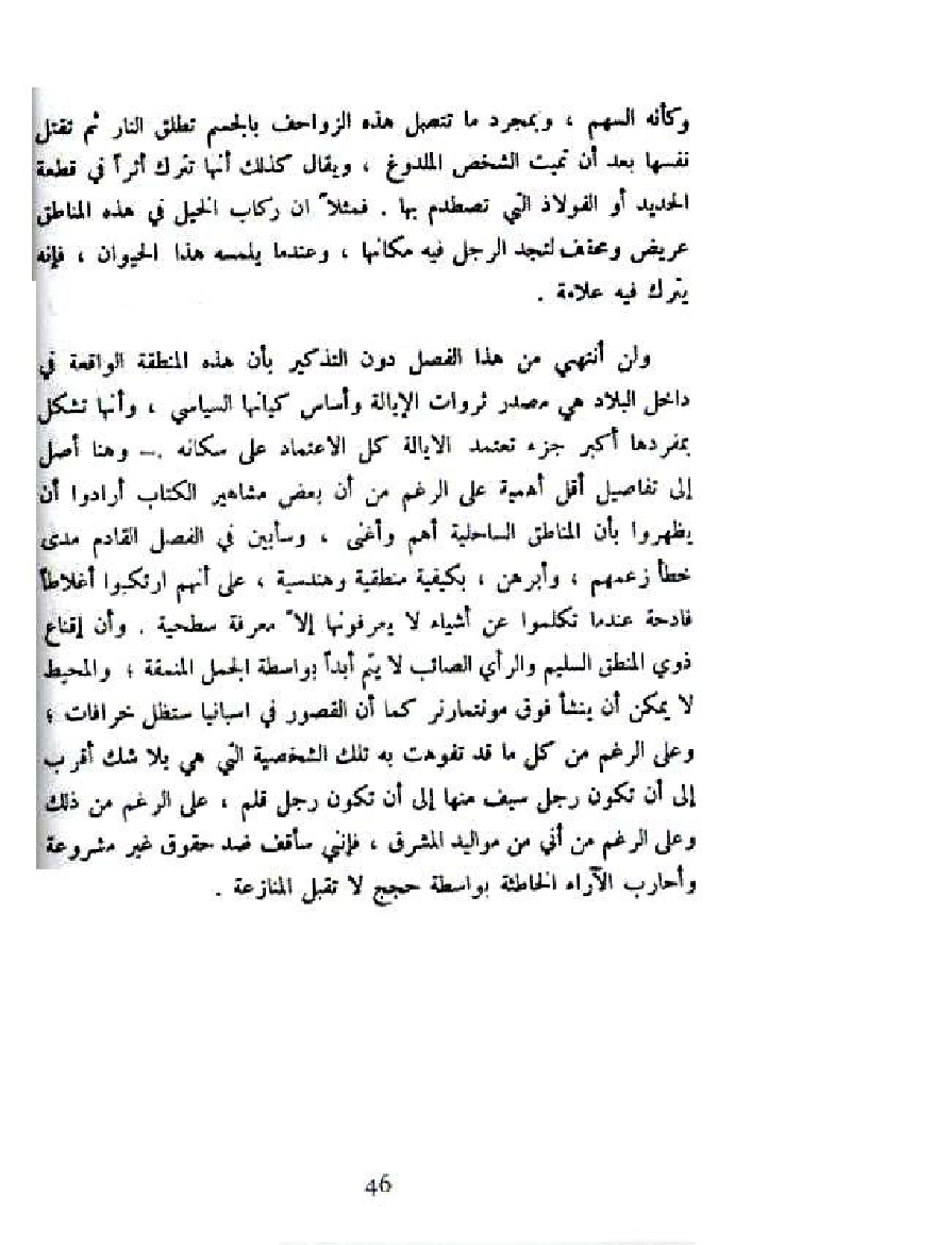 ولن أنتهي من هذا الفصل دون التذكير بأن هذه المنطقة الواقعة في داخل البلاد هي مصدر ثروات الإيالة وأساس كيانها السياسي، وأنها تشكل بمفردها أكبر جزء تعتمد الإيالة كل الاعتماد عل سكانه. - وهنا أصل إلى تفاصيل أقل أهمية على الرغم من أن بعض مشاهير الكتاب أرادوا أن يظهروا بأن المناطق الساحلية أهم وأغنى، وسأبين في الفصل القادم مدى خطأ زعمهم، وأبرهن، بكيفية منطقية وهندسية، على أنهم ارتكبوا أغلاطا فادحة عندما تكلموا عن أشياء لا يعرفونها إلا معرفة سطحية. وأن إقناع ذوي المنطق السليم والرأي الصائب لا يتم أبدا بواسطة الجمل المنمقة، والمحيط لا يمكن أن ينشأ فوق مونتمارنر كما أن القصور في اسبانيا ستظل خرافات، وعلى الرغم من كل ما قد تفوهت به تلك الشخصية التي هي بلا شك أقرب إلى أن تكون رجل سيف منها إلى أن تكون رجل قلم، عل الرغم من ذلك وعلى الرغم من أني من مواليد المشرق، فإنني سأقف ضد حقوق غير مشروعة وأحارب الآرام الخاطئة بواسطة حجج لا تقبل المنازعة.