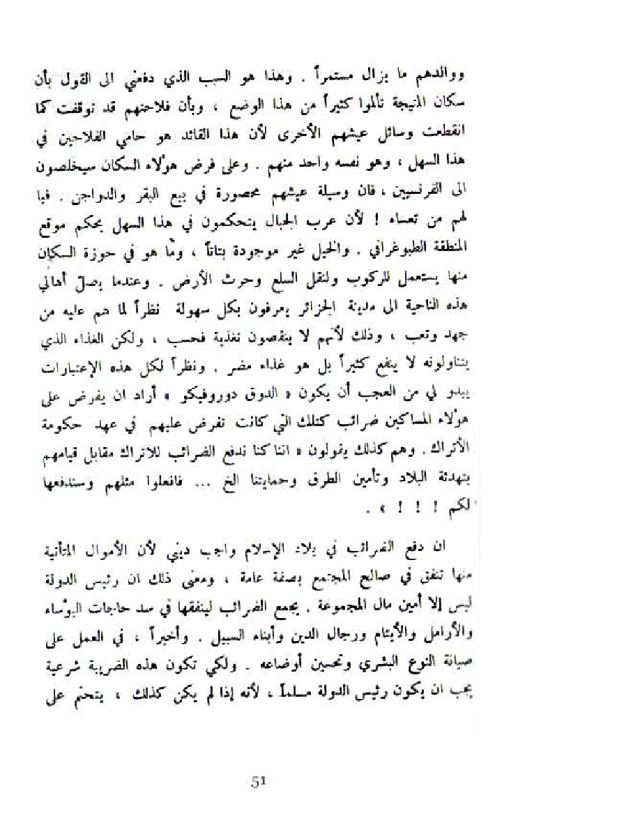 ان دفع الضرائب في بلاد الإسلام واجب ديني لأن الأموال المتأتية منها تنفق في صالح المجتمع بصفة عامة، ومعنى ذلك ان رئيس الدولة ليس إلا أمين مال المجموعة. يجمع الضرائب لينفقها في سد حاجات البؤساء والأرامل والأيتام ورجال الدين وأبناء السبيل. وأخير، في العمل على صيانة النوع البشري وتحسين أوضاعه. ولكي تكون هذه الضريبة شرعية يجب ان يكون رئيس الدولة مسلما، لأنه إذا لم يكن كذلك، يتحتم على