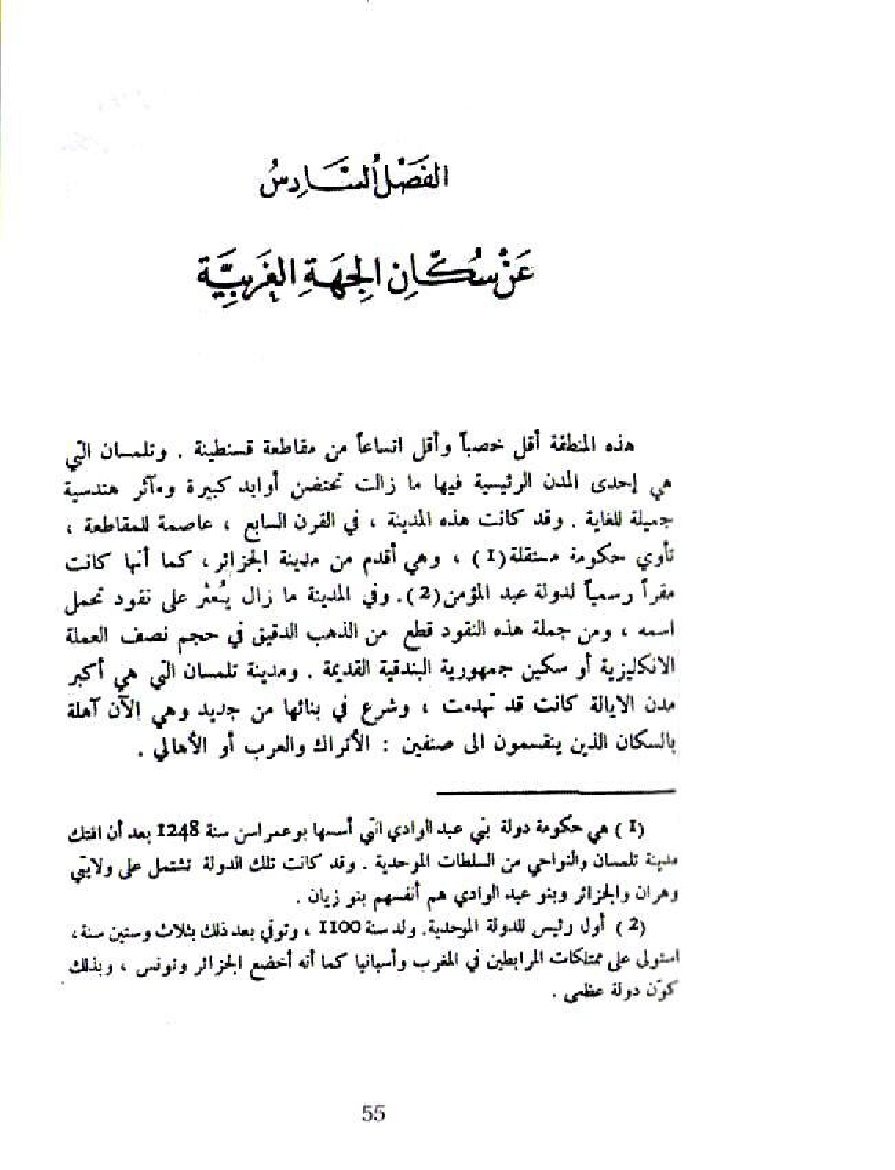 هذه المنطقة أقل خصبا وأقل اتساعا من قسنطينة. وتلمسان التي هي إحدى المدن الرئيسية فيها ما زالت تحتضن أوابد كبيرة ومآثر هندسية جميلة للغاية. وقد كانت هذه المدينة، في القرن السابع، عاصمة للمقاطعة، تأوي حكومة مستقلة (¬1)، وهي أقدم من مدينة الجزائر، كما أنها كانت مقرا رسميا لدولة عبد المؤمن (¬2). وفي المدينة ما زال يعثر على نقود تحمل اسمه، ومن جملة هذه النقود قطع من الذهب الدقيق في حجم نصف العملة الانكليزية أو سكين جمهورية البندقية القديمة. ومدينة تلمسان التي هي أكبر مدن الإيالة كانت قد تهدمت، وشرع في بنائها من جديد وهي الآن آهلة بالسكان الذين ينقسمون إلى صنفين: الأتراك والعرب أو الأهالي.