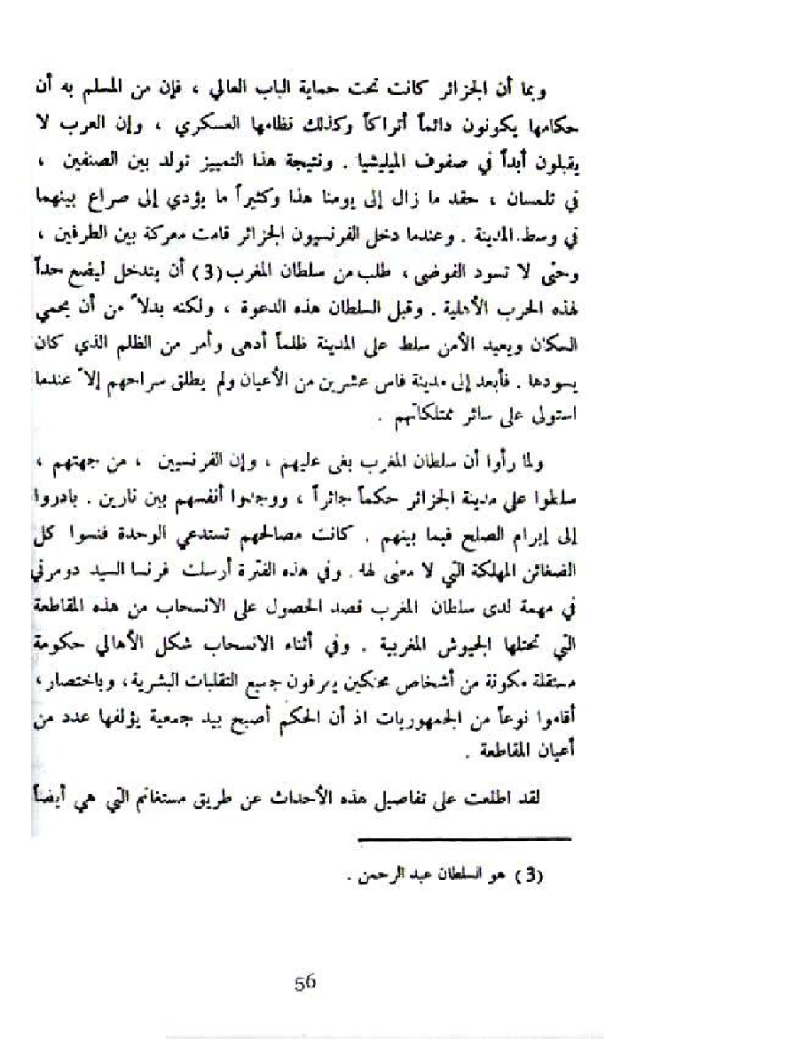 وبما أن الجزائر كانت تحت حمياة الباب العالي، فإن من المسلم به أن حكامها يكونون دائما أتراكا وكذلك نظامها العسكري، وإن العرب لا يقبلون أبدا في صفوف الميليشيا. ونتيجة هذا التمييز تولد بين الصنفين، في تلمسان، حقد ما زال إلى يومنا هذا وكثيرا ما يؤدي إلى صراع بينهما في وسط المدينة. وعندما دخل الفرنسيون الجزائر قامت معركة بين الطرفين، وحتى لا تسود الفوضى، طلب من سلطان المغرب (¬3) أن يتدخل ليضع حدا لهذه الحرب الأهلية. وقبل السلطان هذه الدعوة، ولكنه بدلا من أن يحمي السكان ويعيد الأمن سلط على المدينة ظلما أدهى وأمر من الظلم الذي كان يسودها. فأبعد إلى مدينة فاس عشرين من الأعيان ولم يطلق سراحهم إلا عندما استولى على سائر ممتلكاتهم.