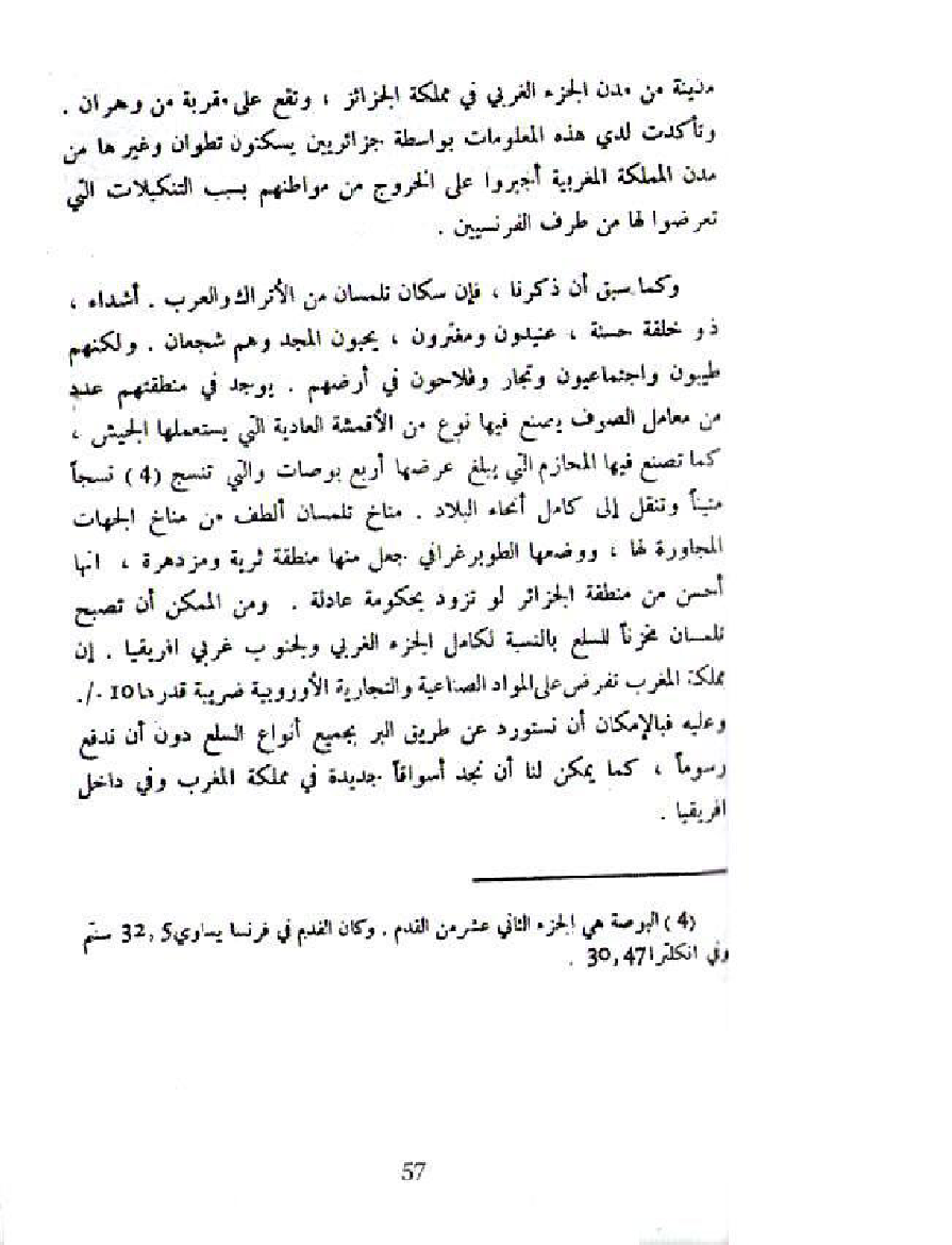 وكما سبق أن ذكرنا، فإن سكان تلمسان من الأتراك والعرب، أشداء، ذو خلقة حسنة، عنيدون ومغترون، يحبون المجد وهم شجعان. ولكنهم طيبون واجتماعيون وتجار وفلاحون في أرضهم. يوجد في منطقتهم عدد من معامل الصوف يصنع فيها نوع من الأقمشة العادية التي يستعملها الجيش، كما تصنع فيها المحازم التي يبلغ عرضها أربع بوصات والتي تنسج (¬4) نسجا متينا وتنقل إلى كامل أنحاء البلاد. مناخ تلمسان ألطف من مناخ الجهات المجاورة لها، ووضعها الطوبرغرافي جعل منها منطقة ثرية ومزدهرة، انها أحسن من منطقة الجزائر لو تزود بحكومة عادلة. ومن الممكن أن تصبح تلمسان مخزنا للسلع بالنسبة لكامل الجزء الغربي ولجنوب غربي افريقيا. إن مملكة المغرب تفرض على المواد الصناعية والتجارية الأوروبية ضريبة قدرها 10%.
