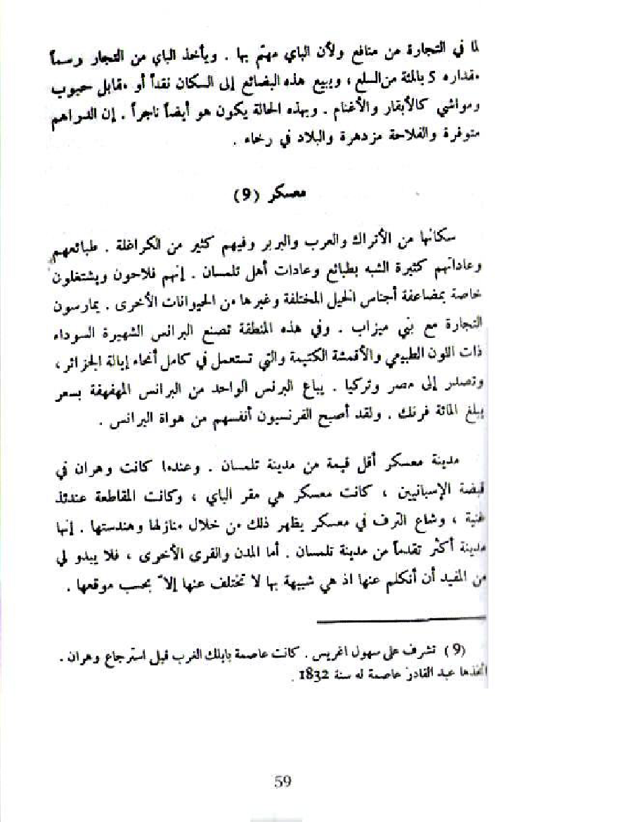 مدينة معسكر أقل قيمة من مدينة تلمسان. وعندما كانت وهران في قبضة الإسبانيين، كانت معسكر هي مقر الباي، وكانت المقاطعة عندئذ غنية، وشاع الترف في معسكر يظهر ذلك من خلال منازلها وهندستها. إنها مدينة أكثر تقدما من مدينة تلمسان. أما المدن والقرى الأخرى، فلا يبدو لي من المفيد أن أتكلم عنها إذ هي شبيهة بها لا تختلف عنها إلا بحسب موقعها.