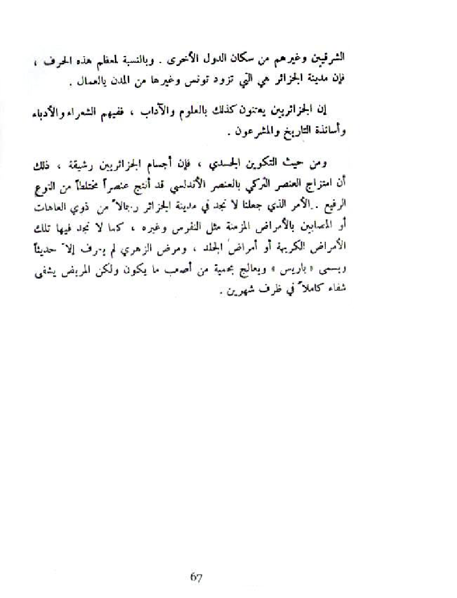 ومن حيث التكوين الجسدي، فإن أجسام الجرائريين رشيقة، ذلك أن امتزاج العنصر الترر بالعنصر الأندلسي قد أنتج عنصرا مختلطا من النوع الرفيع. الأمر الذي جعلنا لا نجد في مدينة الجزائر رجالا من ذوي العاهات أو المصابين بالأراض المزمنة مثل النفرس وغيره، كما لا نجد فيها تلك الأمراض الكريهة أو أمراض الجلد، ومرض الزهري لم يعرف إلا حديثا ويسمى (باريس) ويعالج بحمية من أصعب ما يكون ولكن المريض يشفى شفاء كاملا في ظرف شهرين.