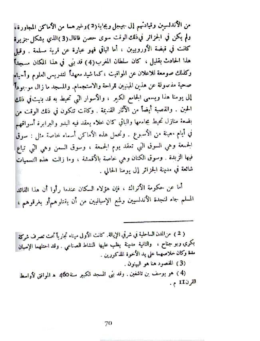 من الأندلسيين وقيادتهم إلى جيجل وبجاية (¬2) وغيرهما من الأماكن المجاورة، ولم يكن في الجزائر في ذلك الوقت سوى حصن فانال (¬3) الذي يشكل جزيرة كانت في قبضة الأوروبيين، أما الباقي فهو عبارة عن قرية مسلمة. وقبل هذا الحادث بقليل، كان سلطان المغرب (¬4) قد بنى في هذا المكان مسجدا وكذلك صومعة للاعلان عن المواقيت، كما شيد معهدا لتدريس العلوم وأحياء صحية مفصولة عن هذين المبنيين للراحة والاستجمام. والمسجد ما زال موجودا إلى يومنا هذا وسمى الجامع الكبير، والأسوار التي تحيط به قد بنيت في ذلك الحين. والقصبة أيضا من الآثار القديمة. وكانت تتكون في ذلك الوقت من بضعة منازل تحيط بجامعها والباقي كان خلاء يعقد فيه البدو والبرابرة أسواقهم في أيام معينة من الأسبوع. وتحمل هذه الأماكن أسماء خاصة مثل: سوق الجمعة وهي السوق التي تعقد يوم الجمعة، وسوق السمن وهي التي تباع فيها الزبدة. وسوق الكتان وهي خاصة بالأقمشة، وما زالت هذه التسميات شائعة في مدينة الجزائر إلى يومنا الحالي.