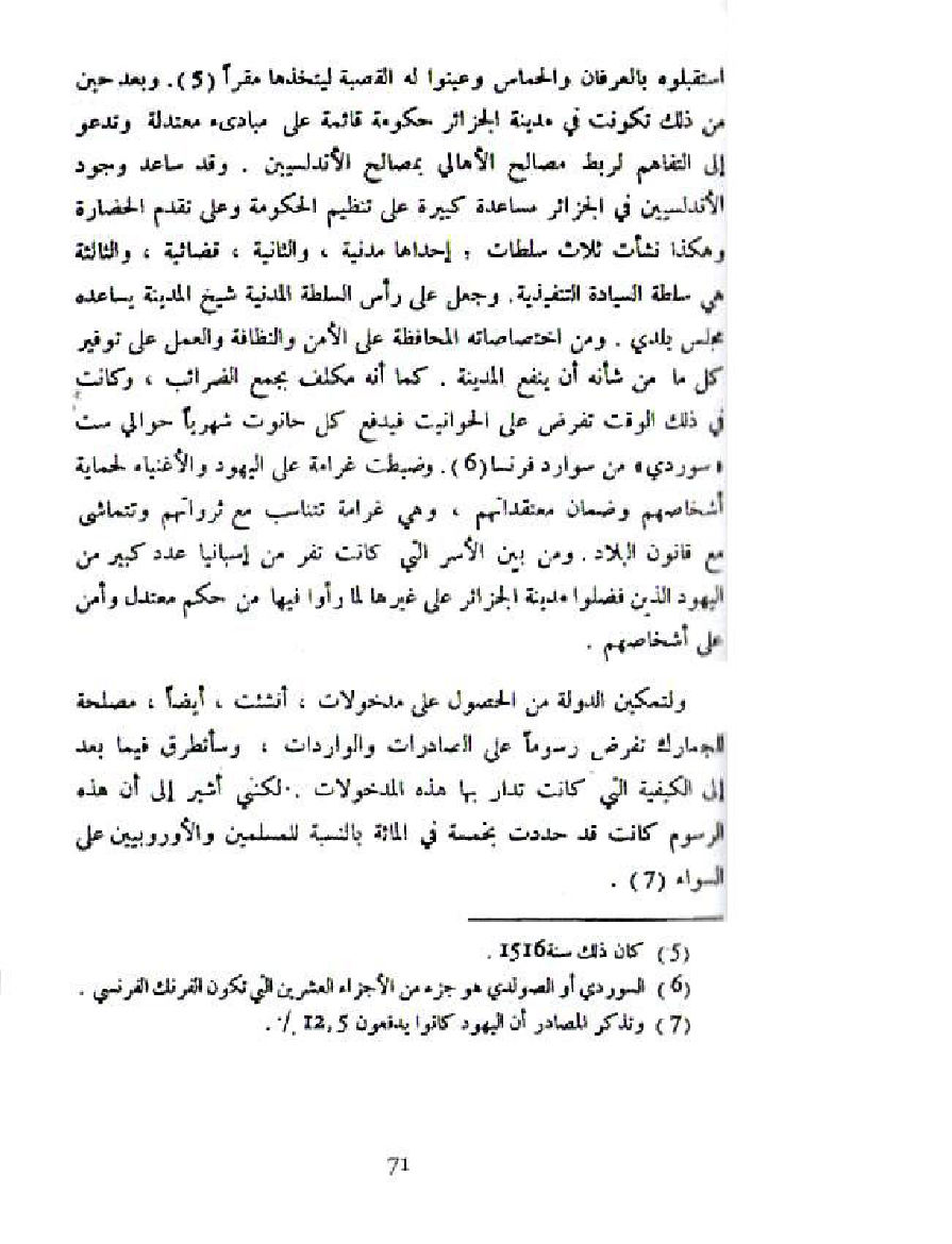 استقبلوه بالعرفان والحماس وعينوا له القصبة ليتخذها مقرا (¬5). وبعد حين من ذلك تكونت في مدينة الجزائر حكومة قائمة على مبادىء معتدلة وتدعو إلى التفاهم لربط مصالح الأهالي بمصالح الأندلسيين. وقد ساعد وجود الأندلسيين في الجزائر مساعدة كبيرة على تنظيم الحكومة وعلى تقدم الحضارة وهكذا نشأت ثلاث سلطات: إحداها مدنية، والثانية، قضائية، والثالثة هي سلطة السيادة التنفيذية. وجعل على رأس السلطة المدنية شيخ المدينة يساعده مجلس بلدي. ومن اختصاصاته المحافظة على الأمن والنظافة والعمل على توفير كل ما من شأنه أن ينفع المدينة. كما أنه مكلف بجمع الضرائب، وكانت في ذلك الوقت تفرض على الحوانيت فيدفع كل حانوت شهريا حوالي ست (سوردي) من سوارد فرنسا (¬6). وضبطت غرامة على اليهود والأغنياء لحماية أشخاصهم وضمان معتقداتهم، وهي غرامة تتناسب مع ثرواتهم وتتماشى مع قانون البلاد. ومن بين الأسر التي كانت تفر من إسبانيا عدد كبير من اليهود الذين فضلوا مدينة الجزائر على غيرها لما رأوا فيها من حكم معتدل وأمن على أشخاصهم.