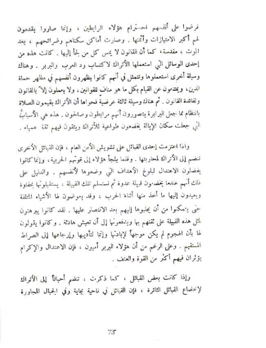 وإذا اعتزمت إحدى القبائل على تشويش الأمن العام، فإن القبائل الأخرى تنضم إلى الأتراك لمحاربتها. وقلما يلجأ هؤلاء إلى قوتهم الحربية، وإنما كانوا يفضلون الاعتدال لبلوغ الأهداف التي وضعوها لأنفسهم. والدليل على ذلك أنهم عندما يخضعون قبيلة عدوة ثم تستسلم تلك القبيلة، يستقبلونها بحفاوة ويعيدون إليها ما أخذ منها أثناء الحرب، وقد يعوضون لها الأشياء المتلفة حتى يتمكنوا من أن يجلبوها إليهم بعد الانتصار عليها. لقد كانوا يبرهنون لمثل هذه القبيلة على ثقتهم بها ويدفعونها إلى أن تعيش هادئة. وكانوا يقولون لها بأن الهجوم لم يكن موجها لإبادتها وإنما لتأديبها وإرجاعها إلى الصراط المستقيم. وعلى الرغم من أن هؤلاء البربر أميون، فإن الاعتدال والإكرام يؤثران فيهم أكثر من القوة والعنف.